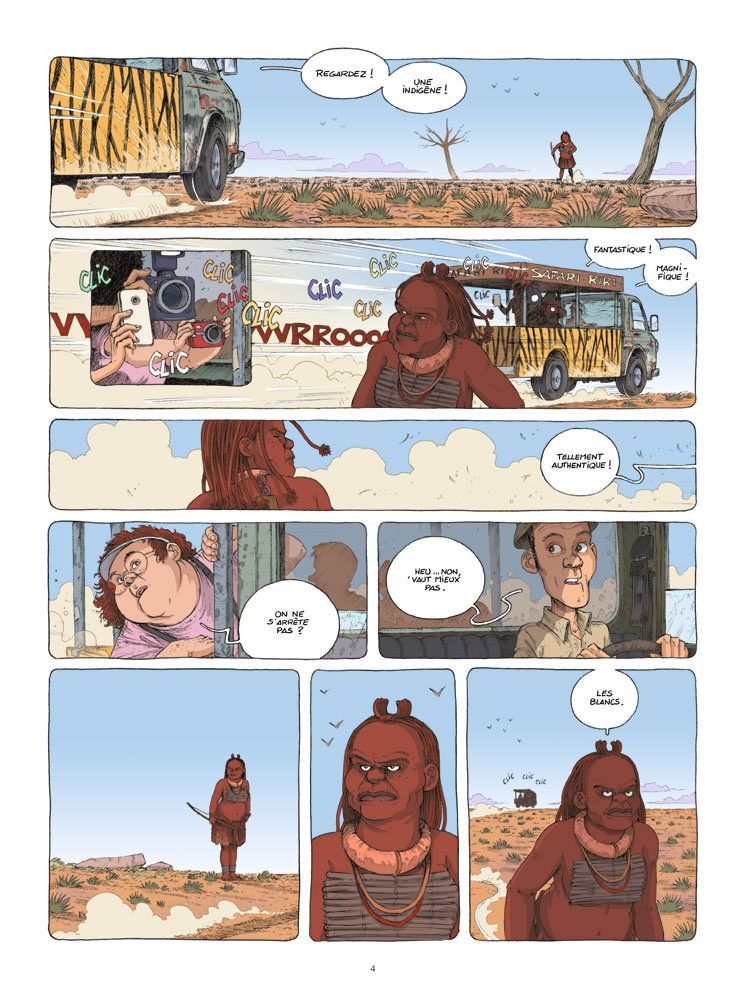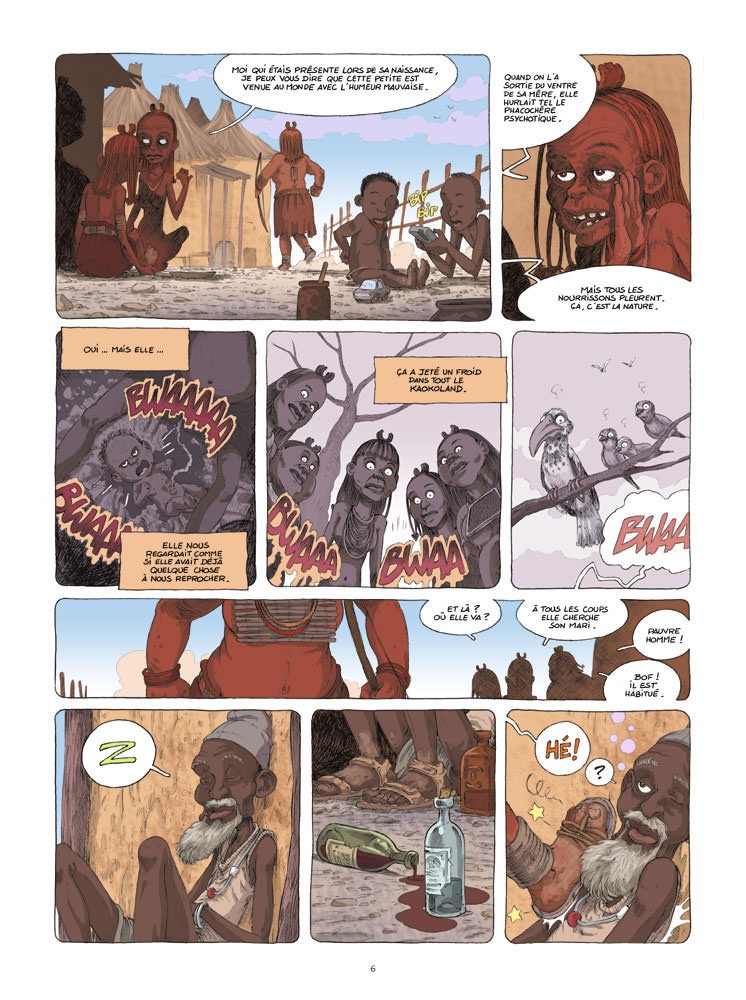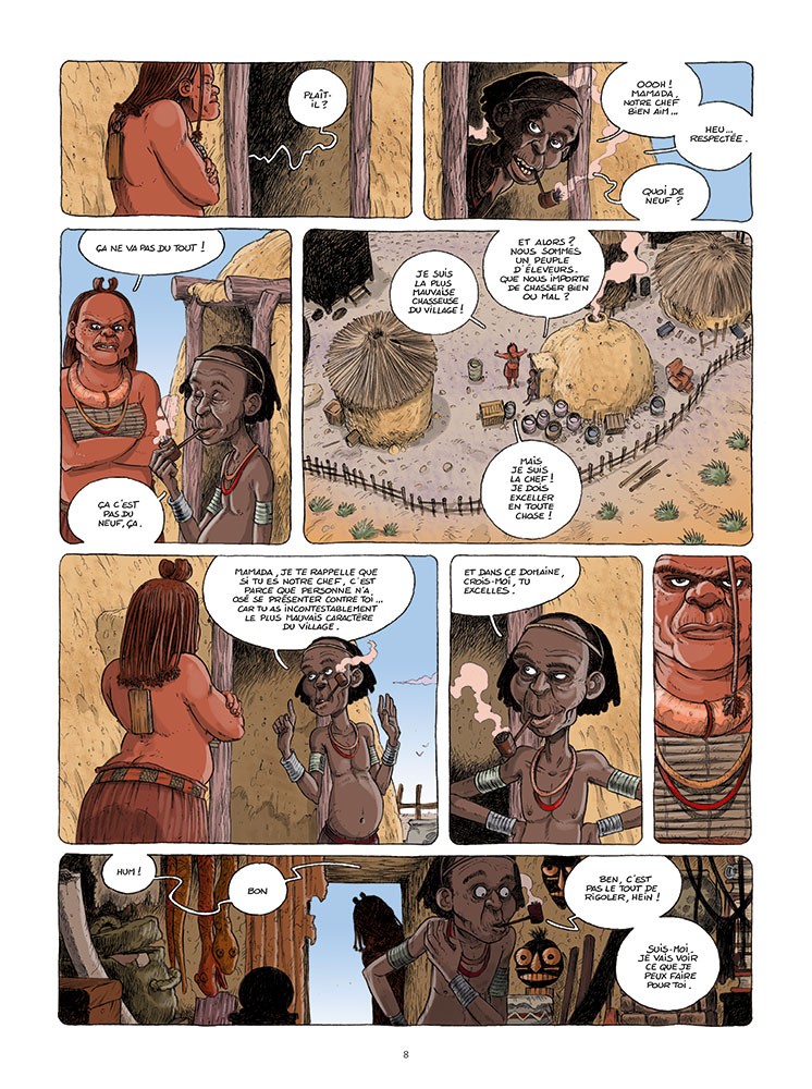 Dans ce premier tome de Mamada, David Ratte s'amuse de la confrontation des cultures et de ses préjugés, avec un humour incisif et tordant. Le dessin se veut comme un mélange de réalisme dans les décors et de caricature dans les personnages, qui rend le tout agréable et crédible. La misanthrope Mamada se retrouve donc perdue en plein Paris, tandis que les "victimes" qu'elle frappe de son pouvoir - non sans un dialogue ironique - se téléporte pour leur part dans son village en Namibie. Un sacré dépaysement pour l'un comme pour l'autre. La destinée de Mamada va changer au gré des rencontres, surtout celle d'une jeune fille qui menace de commettre l'irréparable. Quant à l'oiseau contaminé, il n'est pas beaucoup mis en avant dans ce volume mais ces aventures sont tout aussi amusantes. Il a en effet développé une force incommensurable et de chassé, il va devenir le chasseur des plus grands fauves d'Afrique. A noter que ce tome est une réédition d'un ouvrage paru l'an dernier, seule la couverture a été modifiée.