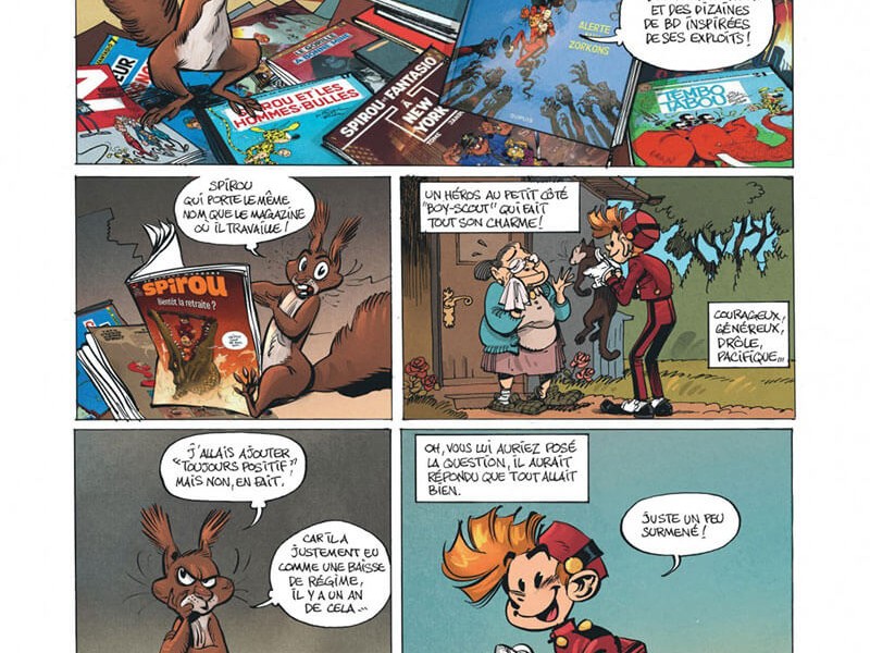 Une curieuse mise en abyme parodique quasi pamphlétaire, une forme de (dépôt de) bilan aussi. Si le lecteur amnésique ne se trompe pas, le personnage de Spirou appartient aux éditions Dupuis, non à des ayant-droits. Ce qui implique que l’éditeur peut littéralement en faire ce qu’il veut, en le déclinant à toutes les sauces. Fabien Vehlmann se lance donc dans une mini-diatribe dont l’aspect caricatural camoufle à peine son propos sur la manière dont le personnage a été traité. Entre jugement sociétal global et égratignure éditoriale à peine voilée, il saupoudre l'ensemble d’un constat amer sur le statut des auteurs. Le lecteur tel Rantanplan sent confusément l’envie réelle de Fabien Vehlmann de remettre le petit groom dans le cœur des lecteurs (en particulier des plus jeunes), tout en essayant de les sensibiliser à l’absurdité de notre époque éparpillée dans ses propres contradictions. Salutaire ? Spirou en bon héros, modèle d’intelligence d’ouverture d’esprit, agit d'ordinaire avec son cerveau, pas avec des gadgets, plutôt réservés aux comics , qui en prennent pour leur grade. Pourtant les méchants de Spirou (Zantafio, Zorglub, Vito La Déveine, etc.) sont aussi intelligents que lui. Souvent très maladroits, mais très intelligents. En condensant toute l’absurdité (collective et/ou individuelle) de l’époque, puis en fustigeant les ravages des facilités scénaristiques les plus éculées, le fond de l’album semble plutôt visé les SJW (Social Justice Warriors) ces "extrémistes du progrès social" pour lesquels la moindre avancée sociétale doit impérativement s’ériger en dogme incritiquable, inattaquable. La plus petite remarque, même argumentée, valant à son auteur un tombereau d’insultes de leur part.