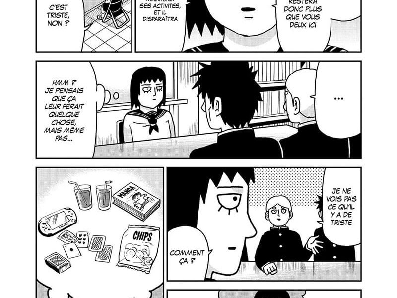 Les vacances d'été approchent et avec elles l'objectif du diplôme pour les élèves de huitième année. Tome Kurata, la présidente du club culturisme se rend compte qu'elle n'a rien pu réaliser pendant cette période. Elle n'a pas pu trouver de télépathe et n'a donc pas pu entrer en contact avec des extraterrestres, ce qui l'a amenée à finalement démanteler le club. Les garçons se rendent compte que c'est la dernière chance de faire quelque chose de significatif dont ils se souviendront pour toujours et demandent de l'aide aux autres. Ce manga dépeint le conflit et la croissance d'un adolescent qui a quelque chose de différent. Tome-chan, bavardant et mangeant des bonbons, erre également dans cette période charnière du passage de l'enfance à l'âge adulte. La personne qu'elle recherchait est venue, Mob a visité le bureau. Tome-chan est toujours optimiste et implacable. En fait, c'est une fille douce avec un fort sens des responsabilités. Durant la deuxième partie du volume, nous avons enfin commencé à parler de Mob et Tsubomi, Mob ayant enfin décidé d'écouter ses sentiments. Par rapport au développement des vagues de colère du volume précédent, nous avons senti que c'était un volume avec de nombreuses scènes réconfortantes. Cependant, un accident inattendu se produit à la fin. La représentation soignée de chaque personnage est toujours la même et il est très agréable que chaque changement et croissance soit également dessiné. De plus, il y a de nombreuses scènes qui invitent au rire. Le fait que Reigen soit vraiment un "bon gars", que Teru a beaucoup changé depuis qu'il a rencontré Mob, et que Minegishi, qui a plus de 5 ans, en est venu à chérir les plantes ...