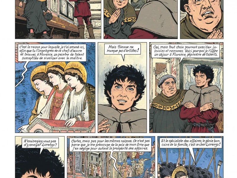 Italie, XIVème siècle. Tolemeo Tolomeï, riche banquier siennois, confie une nouvelle mission à son neveu Vasco Baglioni, jeune marchand italien. Ce dernier va devoir négocier l'achat d'un tableau auprès d'un grand peintre, l'immense Giotto, et le convaincre de peindre l'Église du couvent où Tolemeo veut finir ses jours. La rencontre aura lieu à Florence, sauf que Vasco et son oncle font un détour par Venise où ils rencontrent le doge pour une affaire encore bien délicate. La banque de Tolomeo a laissé des traces compromettantes dans les livres de comptes et il va falloir s'en débarrasser. Un travail qui repulse Vasco, c'est d'ailleurs pour cela qu'il n'héritera pas de l'établissement bancaire, étant beaucoup plus droit et honnête que son frère Lorenzo, véritable homme de main de son oncle, qui s'apprête d'ailleurs à se marier. Oh ce n'est pas tant un mariage d'amour mais plutôt une "transaction" imposée par des contrats.