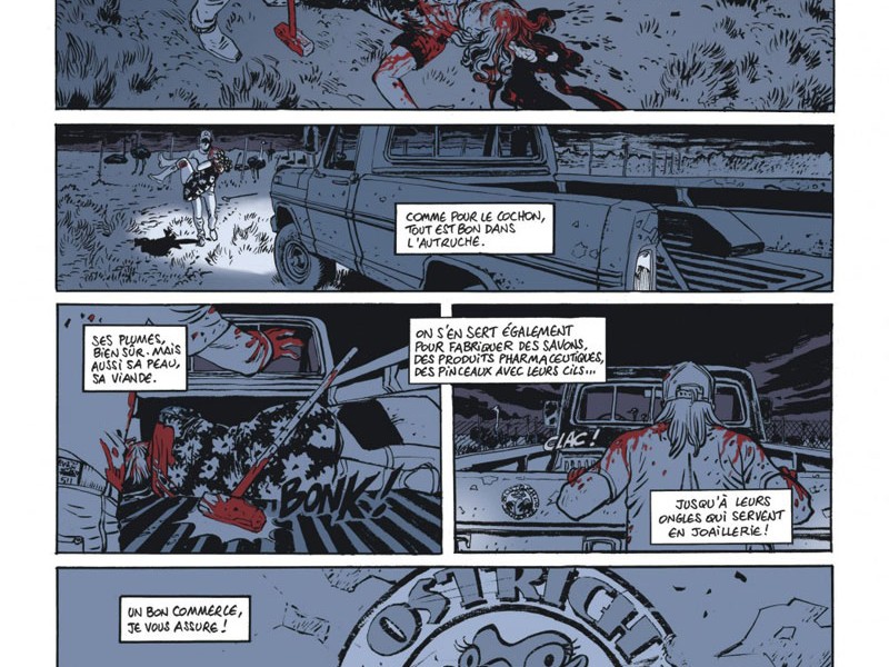 Cet ouvrage unitaire a de quoi surprendre. Zidrou, que l'on a connu plus joyeux conteur, nous livre un scénario sombre aussi violent qu'amusant. Le résultat est surprenant et met en scène des passages bien typés évoluant dans une ferme perdue au milieu de nulle part. Le dessin de Benoît Springer est de très bonne facture, soutenue par un surprenant choix de couleurs et une précision du détail de bon aloi. Un album destiné à un public averti et qui saura divertir les amateurs de thriller.