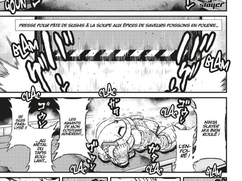 Ce volume comporte deux nouvelles histoires. "Stranger Stranger Than Fiction" débute avec Wired, une nouvelle victime de Ninja Slayer en bien mauvaise posture, puisqu'il s'apprête à être littéralement écrasé par un presse pour pâte de sushis ! Le héros ne fait pas de quartier contre les ninjas et s'il constate la puissance de Tencount, il n'entend pas dévier de sa mission. Alors que Nancy et Ninja Slayer mettent la touche finale à un plan visant à éliminer définitivement Laomoto, Nancy est compromise par un groupe de ninjas imprévus. Avant sa grande mission, Fujikido s'occupe également d'un problème la violence domestique. L'intrigue "Neo-Saitama in Flames" commence quand à elle avec Fujikido prenant un repos bien mérité à la maison, avec Agata qui s'occupe de lui. Laomoto tient une conférence de presse et fait une déclaration choquante. Ninja Slayer rencontre un vieux rival en prenant d'assaut le pilier Tokorozawa. Il faut rappeler que les mangas Ninja Slayer ne respectent pas l'ordre chronologique des romans, et c'est plutôt l'ordre de popularité de ces derniers qui conditionnent les adaptations de Yûki Yogo, connu en France pour Akumetsu (Taifu Comics). On ne s'étonnera pas que le manga ne fasse pas dans la dentelle, et que les victimes civiles vont s'y accumuler. L'aspect graphique est toujours aussi soigné, et les affrontements font preuves d'une rare nervosité.