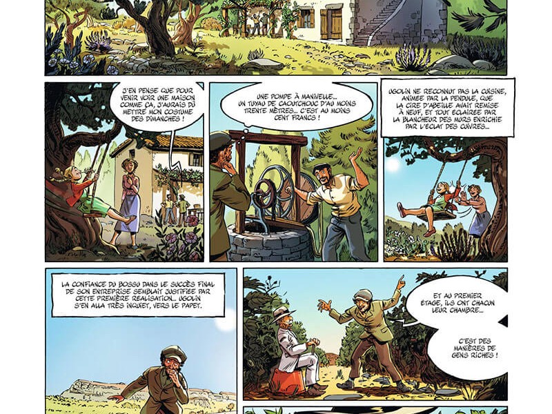 Cet album de 64 pages conclut l'adaptation de Jean de Florette en bande dessinée. Les moments clés de l'histoire sont présents, avec quelques pages documentaires en toute fin d'ouvrage. Le dessin de Christelle Galland - qui succède à Alexandre Tefenkgi - se veut un mélange de caricature (pour les expressions théâtrales des visages) et de réalisme, l'objectif était aussi de s'éloigner de l'adaptation cinématographie de 1986 qui est encore dans tous les esprits. Les couleurs de Yoann Guillé sont chaudes et habilement choisies, l'ensemble est très concluant et saura divertir les amateurs de Pagnol.