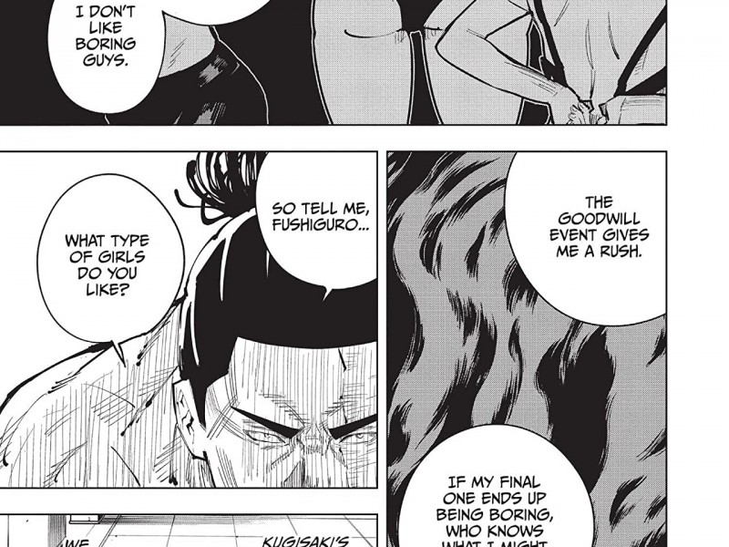 Dans cette itération, nous sommes présentés à un antagoniste potentiel de Junpei Yoshino: un autre lycéen typique qui subit des brimades en étant victime d'intimidation, en adhérant à des philosophies hypocritement enfantines, et ... témoignant d'une attaque de démon massacrant ses bourreaux. Alors que le démon Mahito enfonce ses crochets en lui, Junpei est contraint de faire face aux fantasmes de vengeance qui lui traversaient l'esprit; par exemple, il dirigeait volontiers sa haine envers quiconque serait responsable du meurtre de sa mère, mais il n'offrirait même pas un soupçon de sympathie à quelqu'un d'autre. C'est ici que Jujutsu Kaisen se libère enfin de son moule de manga de bataille dans le rassurant effroi de Mahito sur l'indifférence de Junpei - ce que nous voyons dans son discours n'est pas simplement l'exploitation d'un individu vulnérable, mais les divagations d'un sociopathe dont le pouvoir inné a depuis longtemps abandonné tout semblant de compassion ou d'humanité en faveur de ses intérêts égoïstes. (Pour les fans de The Promised Neverland, repensez à la façon dont les « questions de perspective » de Leuvis font écho à des parallèles étranges). Pour ceux d'entre nous qui sont depuis longtemps dans le jeu Shonen Jump, des sonneries d'alarme sonnent déjà lors de son amitié naissante avec Itadori: Alors que notre héros s'approche initialement de lui à des fins d'interrogation, les deux s'entendent bien même sans savoir où se trouvent leurs philosophies fondamentales.
