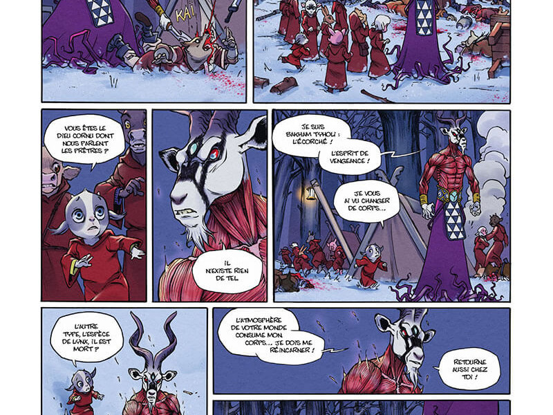 Tiens, encore un nouvel album des 5 Terres, c'est ce que le lecteur pourrait se dire en voyant cette BD chez son libraire : Un monde animalier, un lion barbare, beaucoup de violence. Serait-ce un spin-off peut-être ? Eh ben non. L'Ogre Lion est bien une œuvre singulière. Et de bonne qualité de plus. On suit les aventures de Kgosi, un homme-lion éloigné loin de ses terres et qui est atteint de pertes de mémoire pour des raisons inconnues. Wilt a quant à lui été élevé par les adorateurs du démon Bakham Tyholi, un esprit vengeur qui ne supporte pas l'injustice du monde actuel mais est obligé de se réincarner régulièrement. Quel est son lien avec le lion Kgosi ? C'est ce que l'on découvrira dans ce premier épisode. Bien sûr nos deux compères vont prendre la route ensemble, chacun cherchant à rentrer chez lui. Mais méfiez vous des apparences, les plus forts ne sont pas ceux qu'on imagine dans cet album surprenant ! La galerie de personnages (nombreux mais limpides) est géniale, intelligente et originale, ce qui n'est pas évident tant la comparaison avec Les 5 terres et autres Roi Ours va forcément se faire ! C'est bien écrit, sans aucun ralentissement, et toutes les scènes sont jouissives, que ce soit de combat, de dialogue ou d'humour ! Ce premier tome expose parfaitement la tension, les enjeux et les poids liés à chacun des protagonistes principaux. Le dessin, plus funky que ses pairs est absolument parfait dans le thème et colle au ton du récit qui nous a complètement attrapé et se révèle par moment très drôle. Attention, pas de méprise, le scénario est prenant et ne se perd pas en surenchère comique feinte ! Tout est pesé, pensé, à l'équilibre entre drame, mystère, humour, action, complot et hémoglobine. Il est évident que de la souris cardiaque, de la chauve-souris toxico et de la chèvre manipulatrice, ce n'est pas habituel, même dans la bande dessinée.