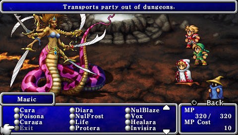![]() Plate-forme : PlayStation Portable Date de sortie : 06 Février 2008 Editeur : Développeur : Genre : RPG Multijoueur : Non Jouable via Internet : Non Test par Nic0077/10 Final Fantasy revient sur PSP. Une refonte concluante ?Final Fantasy I dispose de toutes les caractéristiques qui firent du jeu un énorme succès lorsqu’il fût lancé au Japon sur NES en 1987. Le premier changement notable est dans l’utilisation de graphismes et de sons logiquement améliorés. Les graphismes des arrière-plans ont non seulement été revus et corrigés, mais de nouveaux portraits de personnages ont été ajoutés durant les conversations. L'historie débute lorsque quatre jeunes guerriers, chacun possèdanr un cristal, sont convoqués afin de rétablir l'équilibre harmonieux du monde. Vous allez vite découvrir qu’un sinistre complot pourrait, s’il n’était pas réprimé, avoir comme conséquence la fin de la vie telle que nous la connaissons. Une entité malfaisante a en effet bouleversé la structure du temps afin de prendre le contrôle du monde, ce qui amènera les personnages à voyager dans des mondes qu'ils n'auraient jamais pu imaginer. Un jeu encore en Anglais.Les joueurs doivent voyager à travers le monde, visiter des villes et des donjons et battre les hostiles créatures qu’ils rencontrent. Des personnages amicaux croisés en chemin procureront des indices et des informations vitales qui vous aideront dans votre quête. Chaque bataille gagnée ou tâche accomplie par le joueur seront récompensées par des points d’expérience. Lorsque le joueur en obtient suffisamment, son personnage monte de niveau et devient plus puissant. Les joueurs peuvent également améliorer leurs personnages avec de nouveaux et meilleurs objets ou équipement. Final Fantasy dispose globalement du même contenu que la version sorti il y a près de quatre ans sur Game Boy Advance. Nonobstant, au contraire de l'édition sur consoles Nintendo, le jeu n'a pas été localisé en Français, ce qui est décevant et pourra éloigner certains joueurs de ce titre PSP. VERDICT- Final Fantasy débarque sur PSP dans une édition colorée, mais qui n'a pas été localisé malheureusement. |