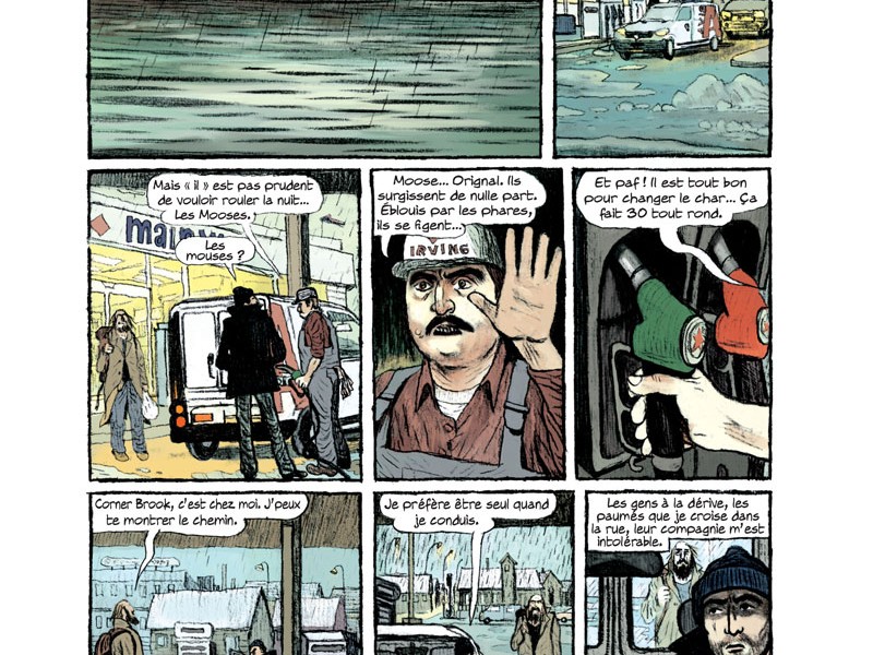 Le scénario de Christian Perrissin (Alexandra David-Neel, Les Chemins de Lhassa) nous entraîne donc sur l'île de Terre Neuve, au large du Canada. Bien qu'il le déteste presque, Josh recherche son père pour rétablir une relation avec lui. En se rendant dans ce lieu reculé, le jeune homme comprend enfin la rudesse de son éducation. Le dessin de Christophe Gaultier se prête particulièrement bien à retranscrire le paysage froid et austère de l'île, tout le contraire des rares autochtones toujours prêts à aider. L'enquête est lente, presque contemplative, et laisse le temps d'observer le trait charbonneux de l'auteur. Les couleurs de Marie Galopin achèvent de mettre en place l'ambiance pesante du récit.