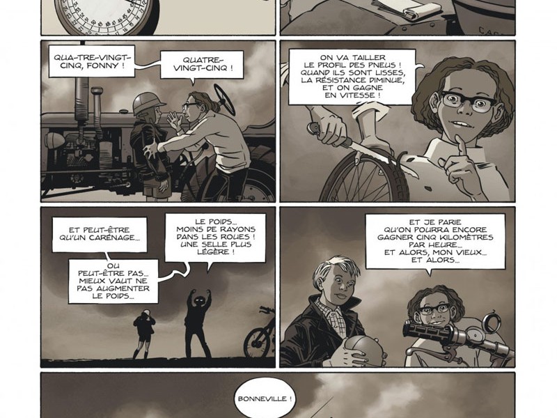 Après La Brigade Juive, Mark Van Oppem (alias Marvano) nous présente une nouvelle trilogie, cette fois reprenant le thème de la course qu'il avait déjà abordé dans Grand Prix. Dans les années 1950, la course automobile s'avère pour le moins dangereuse, beaucoup plus que les compétitions actuelles. Aucune sécurité n'est présente dans les voitures, les ceintures n'existent pas, les réservoirs d'essences sont immenses et facilement inflammables, et la tenue de route s'avère pour le moins précaire. Un virage mal négocié et cela peut se terminer en drame. Le récit s'articule donc autour du sport d'un côté, et de la réalité historique de l'autre. Le premier volume débute en Noël 1959 et se conclut en novembre 1963 par l'assassinat de John Filtzgerald Kennedy. L'action est présentée à travers le regard de Zeldnine Johnson, l'auteur du manuscrit Salt of the Earth dont Bonneville est l'adaptation graphique. Cet album est également une mine d'informations techniques sur les différents véhicules ayant participé à la LSR, de quoi séduire les fondus de mécanique.