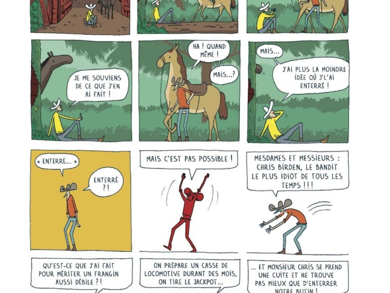 Calfboy est un album réjouissant, rempli de bonnes idées graphiques. Plusieurs planches divisées en gaufrier illustrent en pleines pages des scènes dynamiques où l’on voit les protagonistes évoluer dans le décor afin de créer une impression de mouvements. Le dessin simple et l’humour brillant de Farnos me rappellent l’univers de Tom Gauld. Les dialogues savoureux rythment ce « road trip » à cheval complètement décalé et mené à un train d’enfer.
