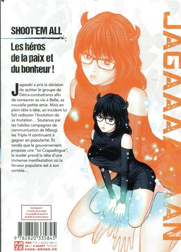 Depuis l'apparition des grenouilles folles à Buppa, qui ont transformé une partie de sa population en "Détraqués", beaucoup d'eau a coulé sous les ponts. Notre "héros" Shin Jagasaki, un policier de quartier qui est devenu un "Détra-combattant", a rejoint le super groupe de Heiwa Happiness Heroes, dirigé par le fanatique Hakuto Misogi. Celui qui, entre autres choses, a déclaré au monde l'existence des Détraqués, révélant en premier lieu sa propre identité. Mais comme nous le savons, dès le début, Shin était loin d'être convaincu de son rôle de héros, préférant consacré ses efforts sur sa relation avec Belle (sa petite-amie). Et la malheureuse première bataille du Triple H n'a pas du tout amélioré la situation. Dans le quatrième volume du splendide Jagaaan, brillamment écrit par Muneyuki Kaneshiro et soutenu par les dessins remarquables et visionnaires de Kensuke Nishida, nous trouvons Shin déterminé à prendre une décision difficile, quitte le groupe des Détra-combattants. Ceci est dû en grande partie aux remarquables compétences politiques et entrepreneuriales du Hakuto (cela aurait-il un sens dans Jagaaan ?), et malgré l'opposition d'une partie de l'opinion publique. Nous voyons un certain politicien commencer à théoriser des mesures drastiques, la loi "Crapadingue", tout en approfondissant le caractère et le passé des différents membres du HHH. Une lecture toujours fortement recommandée.