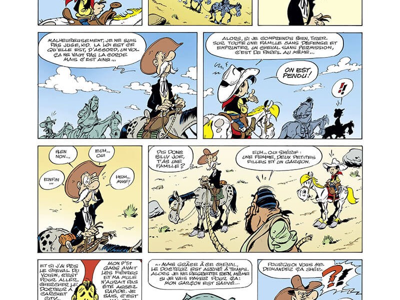 C'est avec grand plaisir que voici "Kid ou Double" et chaque nouvel album vous donne droit à un "Le saviez-vous ?" Ici, le jeune lecteur (ou le vieux lecteur jeune d'esprit) apprend ce qui s'est réellement passé dans l'ancien Far West. Bien sûr, nous avons pensé à la reconnaissance de Kid Lucky. Chemise jaune, gilet noir et foulard rouge. Évidemment, son fidèle cheval Jolly Jumper est également présent, mais Kid Lucky a maintenant beaucoup plus d'amis, vivant dans Nothing Gulch. Cependant, les femmes (à commencer par sa tante Martha, Hurricane Lisette et Joanie Molson) ont toujours la bonne idée de le pousser à bout. En selle pour une nouvelle aventure pleine de gags !