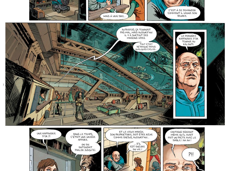 Il s’agit d’une adaptation libre d’une nouvelle de H.P. Lovecraft « Le Cauchemar d’Innsmouth ». Mathieu Sapin transpose l’histoire dans l’espace, et le héros devient ici une héroïne. De plus, ce n’est pas l’héroïne qui raconte, mais un narrateur omniscient. L’histoire est intrigante. L’idée de départ est bonne, et l’ensemble est bien amené. L’ambiance devient étrange et oppressante. La découverte de la planète apporte son lot de questions sur les habitants. Notre héroïne visite, fouille, interroge, et est de plus en plus perplexe. Heureusement, la rencontre avec le vieux Zadok Allen devrait apporter des réponses. Malheureusement, dans la bande dessinée, ce passage est beaucoup trop court et pas assez explicite. La tension ne monte pas assez. La suite s’accélère et devient haletante jusqu’à la fin. Par contre, par rapport à la nouvelle, j’ai trouvé la fin un peu trop abrupte. Il aurait été intéressant de développer un peu plus l’intrigue à ce niveau, ce qui aurait permis de faire monter un peu plus l’angoisse. Les images retranscrivent bien un monde de science-fiction, de désolation, inhospitalier, qui accueille pourtant des êtres vivants. Les traits des personnages sont faits de manière à ce que rien ne soit attrayant, afin de provoquer une gêne.