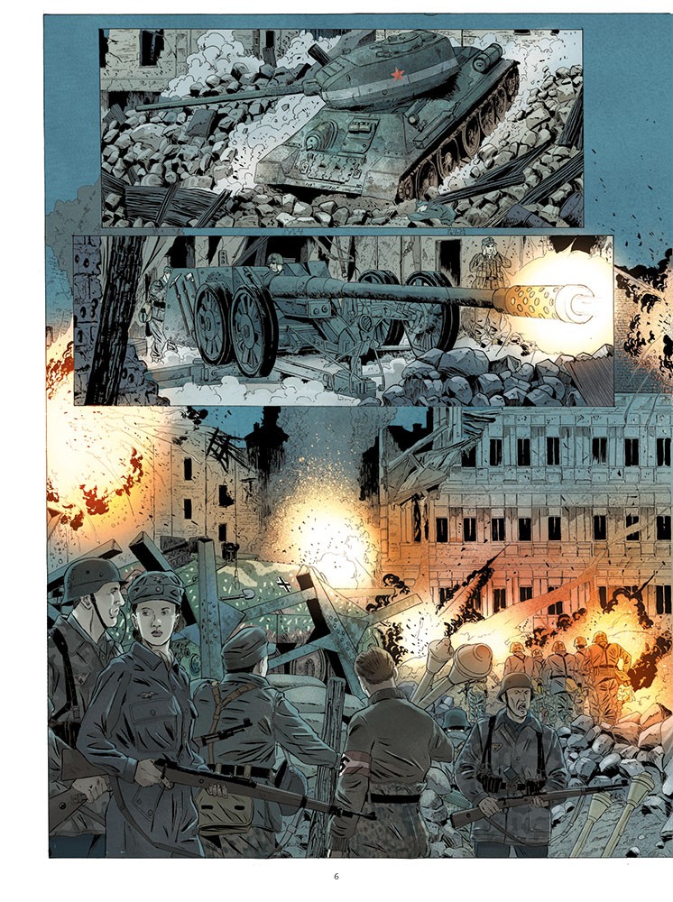 Michel Kœniguer ne prend pas position. En premier lieu, il présente un groupe de soldats qui ont fait le mauvais choix. Il n'appelle pas à la sympathie ou à la compréhension envers eux, ni ne condamne les garçons qui n'ont rien à gagner dans aucun domaine, si ce n'est sauver leur peau et celle de leurs camarades. Des soldats condamnés à une guerre perdue, leurs perspectives d'avenir se limitaient au choix entre les balles russes ou celles d'une escouade d'exécution à leur retour dans leur pays. Ces volontaires étrangers étaient la dernière ligne de défense du Troisième Reich. Le titre Furia Francese est une référence à la bataille de Formoue, qui s'est déroulée en 1495, opposant l'armée de Charles VIII face aux soldats italiens. Les frappes armées dans les rues de Berlin, l'atmosphère apocalyptique, les contacts avec les civils et les soldats allemands, les nombreuses atrocités et les appels à la vengeances pour les enfants en tant que soldats fragiles dominent ce qui deviendra une trilogie. Kœniguer a parfois du mal à dessiner les visages dans ses bandes dessinées, rendant les personnages trop semblables, bien que l'on notera quelques personnages historiques facilement reconnaissables. Cependant, parfois, nous devions bien regarder qui avait été tué au combat. Mais la façon dont il les place sur le grand champ de bataille de Berlin, avec des décors qui sont plus que de simples arrière-plans, est incroyablement impressionnante. Les angles de caméra en font une expérience presque cinématographique. La coloration de Fabien Alquier est une valeur ajoutée absolue pour augmenter la crédibilité.