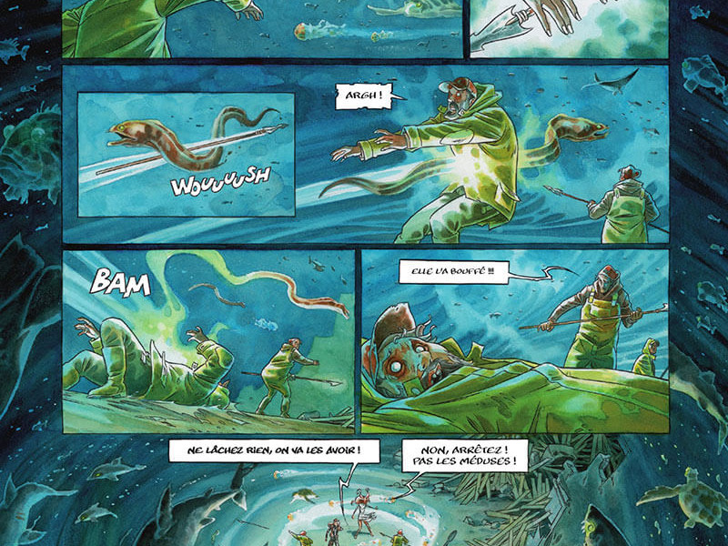 Quelle prémisse ! La Baleine blanche des mers mortes est la première bande dessinée d'Aurélie Wellenstein. Lassés du monde comme nous le sommes, nous l'avons d'abord cherchée sur Google. Vous tombez sur des prix littéraires pour plusieurs de ses histoires fantastiques. Son passage au neuvième art est sans aucun doute une valeur ajoutée au genre quelque peu exploité, mais avec cette bande dessinée, elle paie un certain prix d'apprentissage. Elle en veut trop. Outre le cadre ci-dessus, elle présente deux autres héros intrigants, une fille qui parle aux méduses et un type qui se promène avec un sweat à capuche de Punisher. L'interaction entre les deux, la marée et l'exorciste fournissent sans effort l'inspiration et l'action pour au moins trois bandes dessinées, mais tout est bouclé en un seul album. C'est un peu trop, malheureusement, mais quel potentiel a cette scénariste ! Cela pourrait devenir une série. Le dessinateur Olivier Boiscommun se sent comme un poisson hors de l'eau avec ce one-shot (jeu de mots). Il jette par-dessus bord son style de dessin de Danthrakon et revient à la profondeur de sa série Troll. Le résultat est absolument stupéfiant. Quels dessins ! Quelle couverture aussi.