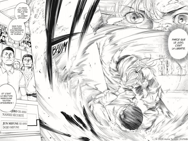 Série courte oblige, les techniques de judo ne sont pas expliquées et décrites plus que ça : en effet, l'héroïne pratique ce sport depuis longtemps et n'en est pas à la phase d'apprentissage, les noms des prises s'enchaînent donc sans plus de détails que ça, rendant le manga parfois "un peu flou" sauf si nous voyons ça juste comme un nom d'attaque à la Hokuto no Ken. Ensuite, l'affrontement final d'une fille de 15 ans contre le champion du monde surprend : Elle se fait évidemment latter la tronche, puis le mets quand même au sol parce que bah, il est pas à 200%. Voir Jun affronter et gagner réellement un judoka plus grand, plus fort aurait été plus beau. Même si elle renverse celui qui a fait arrêter le judo à son oncle, la fin est bizarrement menée. Le dessin est quant à lui assez réussi, parfois très inégal sur les visages (surtout le taille des cous des poids légers, ce sont des buffles), même si les combats se limitent parfois juste à des vagues de traits, une vue plus anatomique (comme à la fin) aurait été mieux rendue. Et les yeux sont quasi absents ou engloutit dans une vue de visage plus large. C'est un peu triste mais nous avons malgré tout apprécié ce manga, à recommander aux fans de mangas de sport, mais pour les autres, son intérêt sera bien moindre...