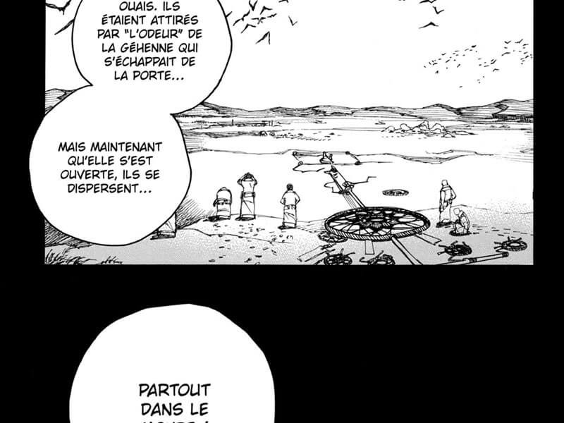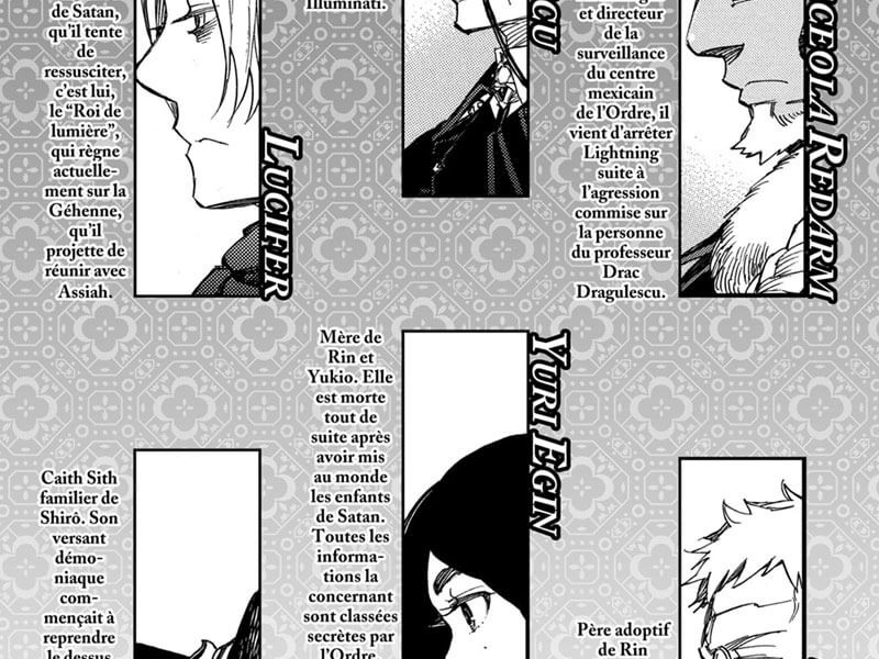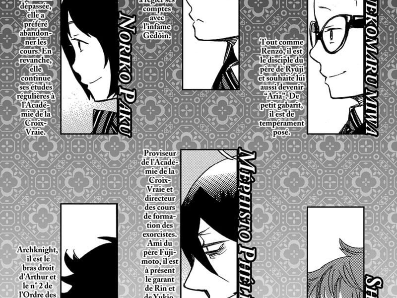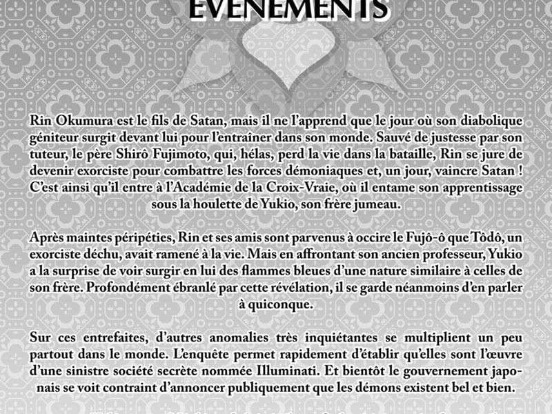 La porte de la Géhenne a été ouverte et les démons sont arrivés dans notre monde. Leur présence provoque le chaos, qui paralyse tout le trafic aérien et automobile, car les attentats qui s'ensuivent conduisent à de nouvelles catastrophes. Personne ne peut dire ce qui se passe réellement, personne ne peut remédier à la situation actuelle - du moins personne parmi les autorités. Cependant, les exorcistes ont-ils une chance de faire face à ce qui se passe ? Pendant ce temps, les jeunes exorcistes sont aux prises avec leurs propres problèmes, se demandant ce qui est vraiment arrivé à Rin. Lorsque les chemins de chacun divergent, car dans une situation de crise chacun doit prendre soin de sa propre tâche, Shiemi commence à réaliser qui elle aime réellement. Mais il n'est pas trop tard - des gens de Grigori viennent la chercher. Quels secrets cache-t-elle ? Et pourquoi ne se souvient-il pas de son passé ? En parlant du passé, Mephisto décide d'envoyer Rin faire un voyage dans le temps pour voir de ses propres yeux qui étaient ses parents et à quoi ressemblait leur vie. Le garçon se déplace seul pour découvrir la vérité. Mais qu'est-ce qui l'attend ? Que verra-t-il ? Et comment cela affectera-t-il sa vie ? Nous avons ici de l'action, une ambiance, un rythme rapide, des thèmes moraux intéressants, des personnages pertinents, beaucoup d'ambiguïtés, encore plus de secrets, beaucoup d'humour. Ls événements sont entrés dans leur apogée, annonçant la grande finale, mais Kazue Kato a trouvé un excellent moyen de prolonger notre plaisir, encore une fois captivant et enchanteur. Aussi un design graphique sensationnel, simple mais plein de détails, d'intuition et de talent.
