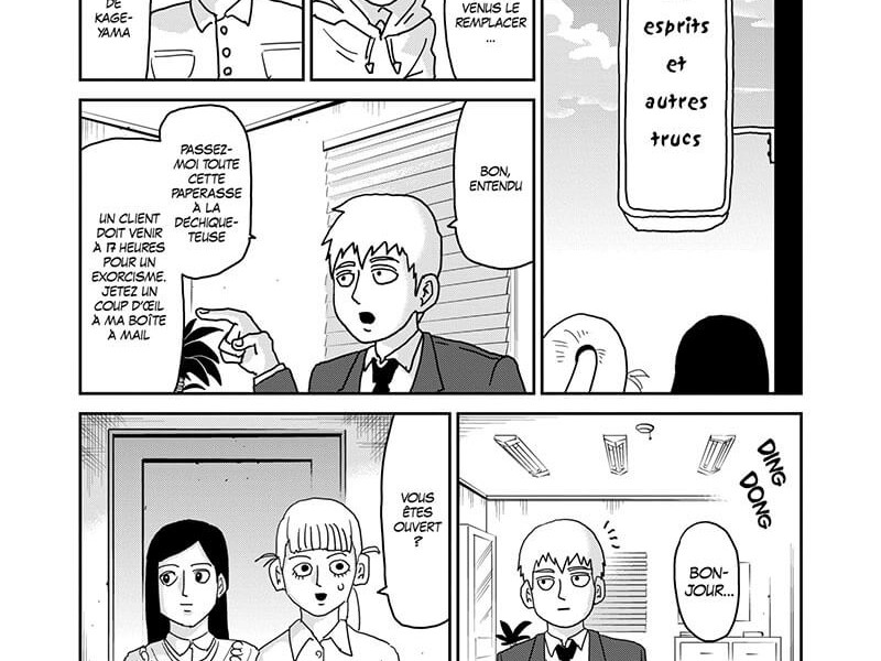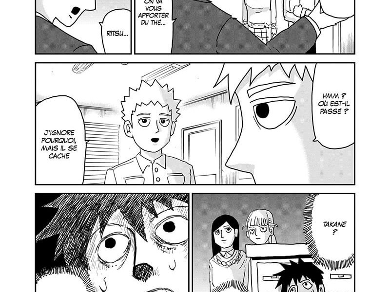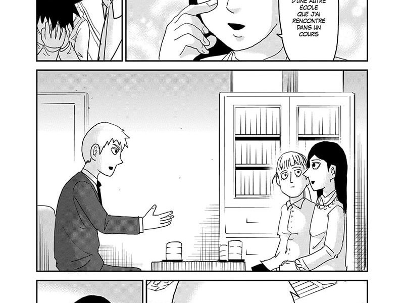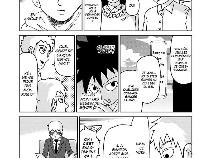 Le grand amour de Mob, Takane Tsubomi, va déménager dans une autre ville. Il prend donc tout son courage à deux mains et demande au téléphone un rendez-vous. Elle dit même oui et Mob se rend, pleine d'espoir, au lieu de rencontre prévu. Mais il est alors gravement blessé dans un accident de la route et perd conscience, et son côté sombre en lui peut prendre le contrôle sans entrave.... mais non sans avoir oublié le rendez-vous avec Tsubomi. Reigen est quant à lui troublé par la récente secousse qui a touché la Ville de l'Assaisonnement et qui dure beaucoup plus longtemps que prévue. Quel volume de clôture digne de ce nom. Une fois de plus, tous les personnages importants ont pu profiter d'un court spectacle pour arrêter Mob hors de contrôle. Destruction, désespoir et acceptation de soi. On parvient à faire passer ses messages subliminaux à nouveau. Bien sûr, dans l'atmosphère imparfaite habituelle. Mais nous avons beaucoup aimé ce style de dessin et Mob et son univers vont beaucoup nous manquer. Avec le final, vous atteignez vraiment le point culminant, un peu shonen et prévisible, mais toujours merveilleux. Un travail qui ne peut pas être jugé par le seul visuel, l'habileté à écrire de ONE émerge tout dans ce manga.
