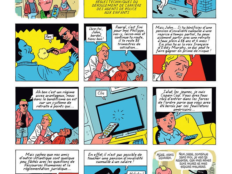 Non, ce ne sont pas « deux flics à Miami » mais bien deux flics amis, que leur chef charge de filer discrètement sa femme qu’il soupçonne d’adultère, alors que celle-ci fait passer sous leurs yeux de la drogue et des armes. C’est dire à quel point ils manquent de jugeotte. Ce deuxième tome des aventures de nos flics déjantés se lit indépendamment du premier. Nous y retrouvons des petites scènes amusantes, rien ne semble arrêter ce duo totalement barré. L'album offre des répliques hilarantes, des dialogues de sourds, pas de prises de têtes, tous les ingrédients qui vont satisfaire les fans de Capt’ain Biceps et autres ouvrages du genre. Il y a même des références au gouvernement et à Gérard Depardieu, de l’humour potache et bon enfant. Les dessins collent avec le style , destiné à une large public même si quelques références télévisuelles ou autres peuvent échapper aux plus jeunes.