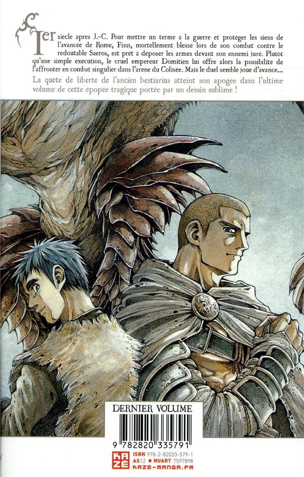 Bestiarius (Toujuushi) est une série en sept tomes parue au Japon aux éditions Shogakukan. Nous sommes en l'an 70, et l'Empire romain commence à conquérir le monde. L'Europe entière est à ses pieds, mais dans un petit village d'Albion, le jeune Arthur lutte contre l'envahisseur. Criminels, innocents, orphelins, demi-humains, wyvernes... Tous constituent les rangs d'esclaves guerriers jetés dans l'arène et forcés de s'entretuer pour divertir l'empereur Domitien et les Romains avides de sang. Le terme "Bestiari" se réfère aux personnes qui ont combattu contre les fauves et créatures légendaires, que ce soit dans des affrontements volontaires ou lors d'exécution pures et simples. Or, certains d'entre eux, comme Finn ou Zénon, ont été élevés aux côtés de ceux qui, aux yeux de Rome, ne sont que de simples bêtes, et ils comptent bien retourner leurs armes contre leurs geôliers... et même contre l'Empire tout entier. Afin de protéger les siens, Finn a été mortellement blessé lors de son combat contre Saeros et semble prêt à déposer les armes. L'Empereur Domitien lui offre la possibilité de l'affronter en combat singulier dans l'arène du Colisée. Mais l'affrontement semble joué d'avance ...