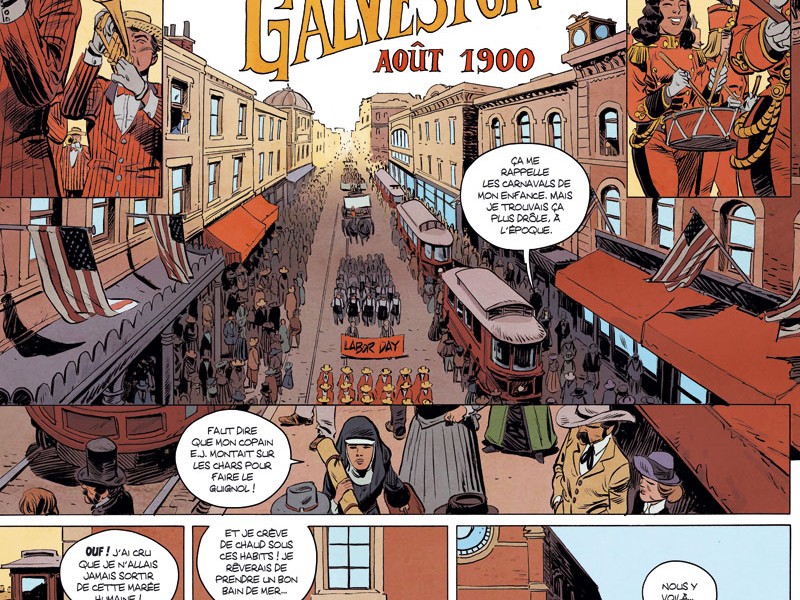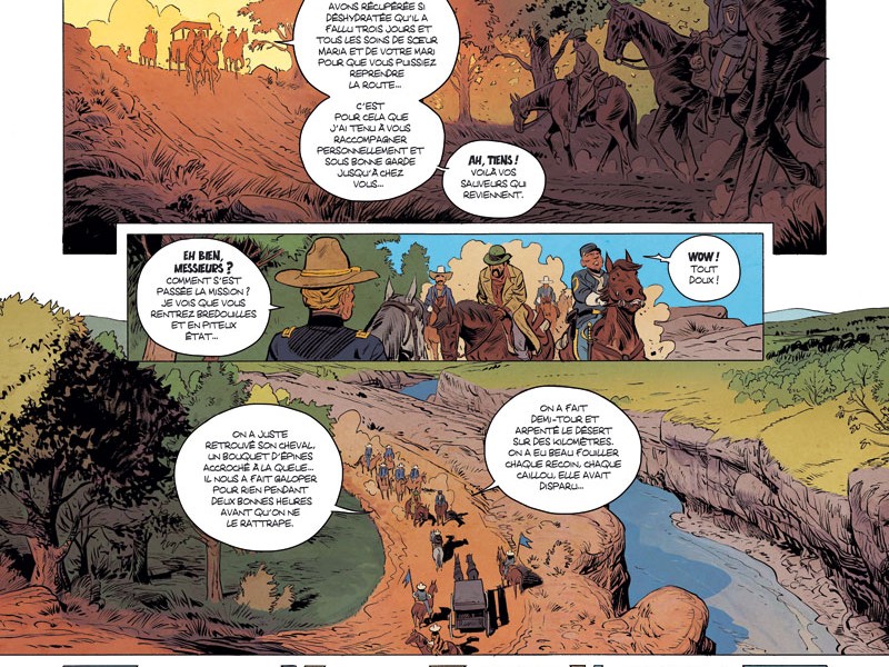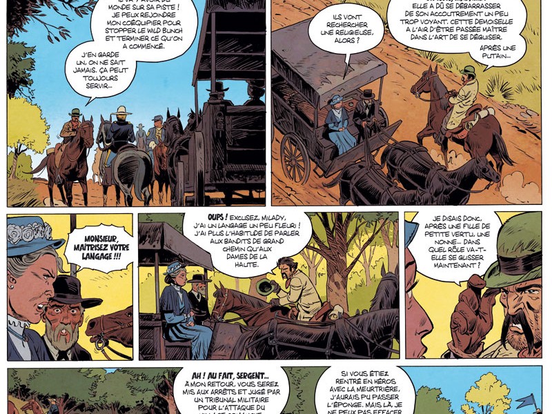 La Vénin est la nouvelle série de Laurent Astier, prévue pour faire cinq tomes. Il faut rappeler qu'en cette année 1900, le Far West américain est encore très sauvage. Outre les règlements de compte, les fuites de malfrats, les relations distendues avec les Indiens, les chasseurs de prime prêts à tout pour toucher leur du, la vie au Texas n'a rien d'un long fleuve tranquille. Il y a beaucoup d'Alexandre Dumas dans ce récit au Far West en plein expansion. (Pensez à un Monte-Cristo féminin). Grâce à de multiples flashbacks, on en apprend enfin davantage sur la mission de Sœur Maria. Ces flashbacks en font une espèce de mystère sur deux époques très agréables et passionnantes. En deux volumes, Laurent Astier a réussi à créer une belle héroïne pour laquelle le lecteur développe énormément d’empathie. Une vrai femme émancipée, bien en avance sur son temps dans un monde où la testostérone masculine, domine. Cette énergie omniprésente se retrouve dans les magnifiques dessins d'Astier. Ainsi, l’originalité du découpage des planche en grid (pleines de petites cases), donne une forme très cinématographique à cette série.