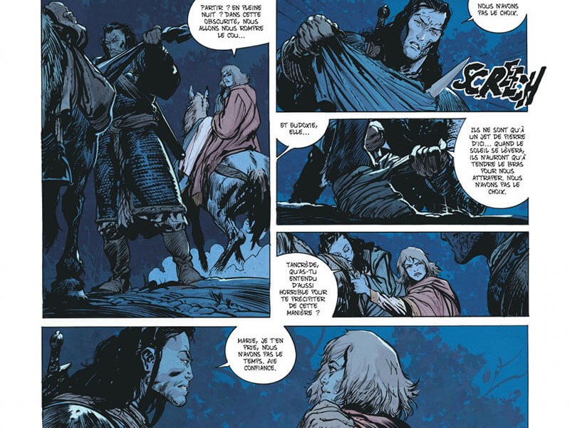 A l'école primaire, nous avons appris dans l'histoire que la période 500-1500 s'appelle le Moyen Âge, une période où nous avons souvent des fantasmes romantiques sur les chevaliers, les demoiselles en détresse, les châteaux, les tournois et les justes combats à l'épée. La réalité était très différente. Toulhaut et Brugeras situent leur série quelque part au milieu du XIe siècle, une période sur laquelle on a peu écrit, mais ce que l'on sait, c'est que la situation était particulièrement bouillante autour de la Méditerranée à l'époque. L'empereur byzantin se bat contre les armées musulmanes, qui tentent de conquérir l'Europe. À leur tour, les dirigeants européens tentent également d'étendre davantage leur territoire. Pendant ce temps, une division se profile à la fois dans le monde islamique et chrétien. Malgré tous ces conflits, il y a aussi beaucoup d'échanges de connaissances et de produits autour de la Méditerranée. De plus, c'est un territoire fertile pour les méchants et les mercenaires qui tentent de s'enrichir. L'une de ces personnes était Robert le Diable, figure légendaire du Moyen Âge et dont s'est inspiré Vincent Brugeras, historien de naissance, pour l'un des personnages principaux d'Ira Dei, Robert Tancrède, un mercenaire normand. (cependant, est-ce son vrai nom?) L'autre est le diacre Etienne, qui tente de répandre de force la vraie foi sur les champs de bataille. "Mon nom est Tancrède" confirme tout le bien que nous pensions des aventures précédentes. Aventures, combat, romantisme, sang et personnages emblématiques tout est réuni pour en faire un future grande saga. On ne boude donc pas son plaisir. Ce quatrième volume est encore riche en action et développements. Les dessins de Ronan Toulhoat sont toujours aussi bruts et précis. Les scènes de combats sont épiques, agressives et d'un dynamisme digne des plus grands combats d'un certain barbare Cimmérien. Le scénario de Brugeas est beaucoup plus profond que ce que l'on peut croire. Subtil mélange d'action, de partie historique peu connue (l'empire Byzantin du début du second millénaire) et de certain contexte géopolitique, il est très entrainant et on tourne les pages avec ardeur.