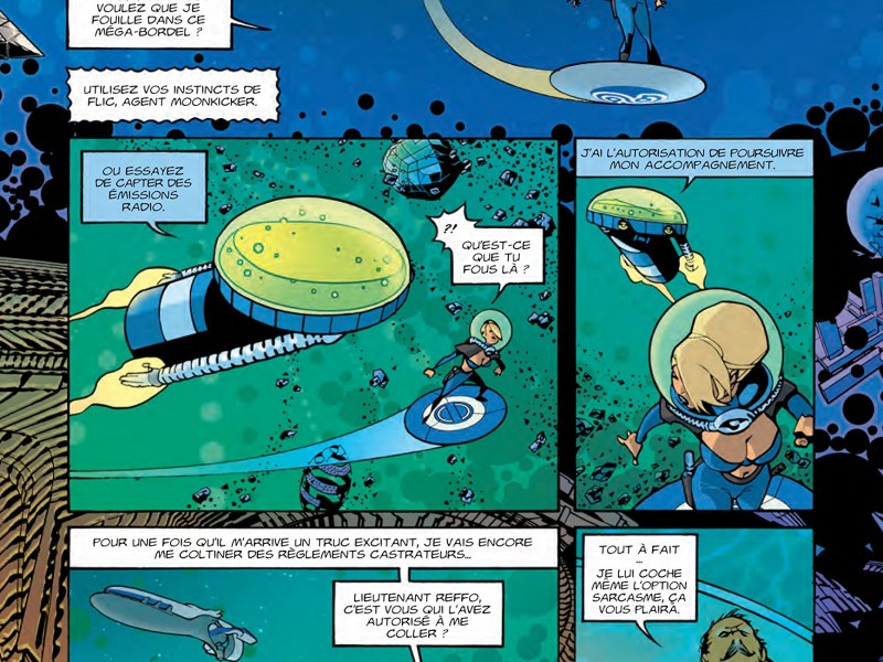 Infinity 8 signe de la science-fiction pour le moins décalée. Ce qui était parti comme un délire entre amis, étonnera les habitués du genre. L'ouvrage s'amuse à briser les codes du comics, c'est divertissant et plus malin qu'on pourrait le penser de prime abord. Ce deuxième opus affiche un humour plus fin, et un graphisme particulièrement soigné.