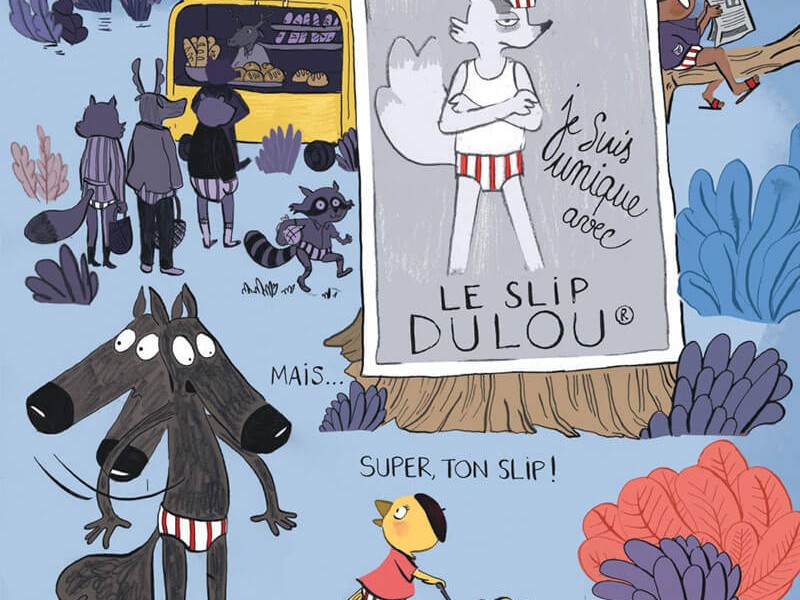 Après des petites vacances, le Loup apprécie de rentrer chez lui et de retrouver sa forêt. Mais... qui lui a piqué son slip ? Tout le monde, en réalité, peu ou prou, car la mode est au slip Dulou. Dépité, dépossédé d'une partie de son identité, le Loup va troquer son célèbre slip à rayures rouges contre un froc comme le montre la couverture. Sans trop dénuder, on peut dire qu'il est question dans cette histoire de publicité, de mode, de norme, de conformisme, d'avoir pour être, et donc de société de "cons-sommes-masses & scions" (la branche sur laquelle nous sommes), pardon de consommation. Mais le Loup sans slip n'a t-il pas perdu une part de lui même ? Et qu'est devenu ce légendaire slip ?