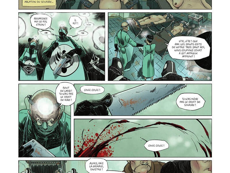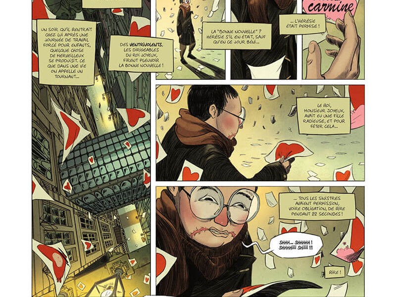 Deux mondes vivent séparément. Les gens d'en haut qui ne peuvent que sourire et rire, et ceux d'en bas qui ne doivent être que sinistre et triste. Mr Hubert 31-36, un sinistre, avec l'envie de rire va ébranler quelques peu l'ordre des choses en croisant la route de la princesse tout sourire, la fille du Roi Joyeux, qui ne calcule pas la gravité de sa situation : elle rit constamment dans un endroit où on se fait tailler les commissures si les zygomatiques sont étendus. Un récit de dystopie moderne, où il faut être bien né pour rire et s'amuser, mais la chute de notre aventure nous offre une surprise magistrale.