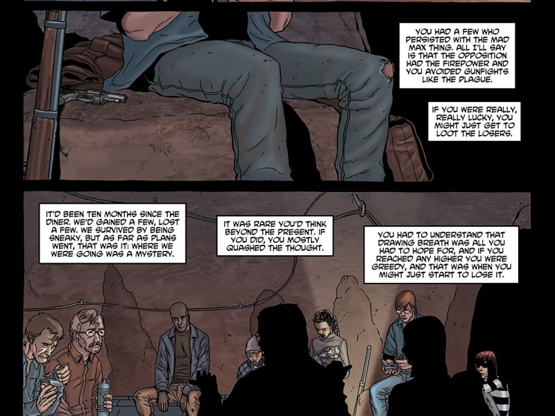 Parce qu'il s'agit essentiellement d'une histoire de zombies/apocalypse, il n'y a pas grand-chose à résumer dans l'intrigue. Nous sommes immédiatement placés dans un groupe d'étrangers qui formeront le "groupe". Nous nous embarquons ensuite pour un voyage à travers le pays en compagnie de notre groupe. L'objectif est simplement de survivre. C'est un autre exemple de la maîtrise géniale d'Ennis de la simplicité narrative. Tout comme dans 'The Punisher', on ne nous dit que l'essentiel. Nos survivants n'ont pas l'intention de guérir tout le monde. Ils ont des enfants et des personnes handicapées dans l'équipe, de sorte qu'ils ont l'impression d'avoir des objectifs qui correspondent à leur situation. En plus de se vanter d'un grand récit simple, l'intrigue avance sur un chemin dentelé où nous sommes mis au défi de suivre les événements. Les personnages meurent hors des pages, les flashbacks ne sont pas annoncés et très peu de choses sont expliquées en détails. Cette simplicité narrative et cette impression de réalisme distinguent 'Crossed' de toutes les autres bandes dessinées et films de zombies. Ennis a été en mesure d'élaborer une approche très stimulante du genre qui rivalisera avec les premiers arcs de " The Walking Dead " et les films zombies de l'ère Romero.
