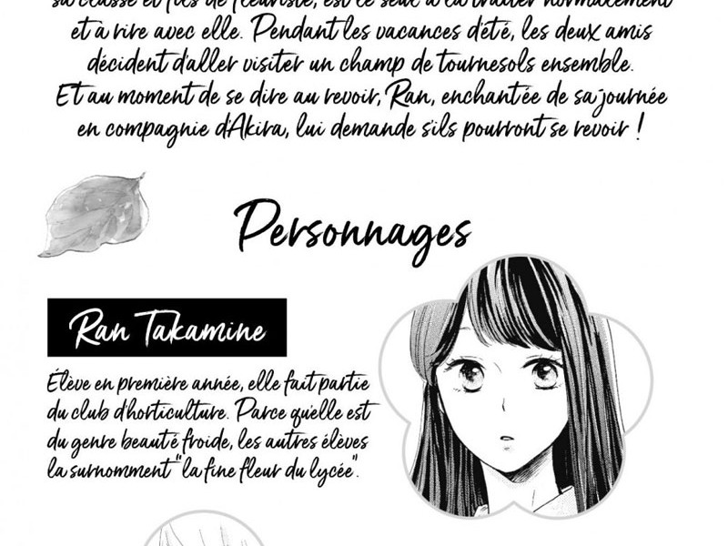 Essayer de décrire Jardin secret simplement par l'intrigue et les personnages pourrait donner aux lecteurs de se retrouver un terrain très familier pour un shojo. C'est vrai que la prémisse ne surprend pas vraiment, mais le premier tome était plutôt concluant. La romance était douce, les deux rôles principaux sont des gens sympathiques qui s'entendent avec un minimum de moqueries. Ran est introvertie sans être d'une timide à toute épreuve. Akira est «le type populaire» par excellence mais il n'a pas l'ego qui va souvent avec. C'est aussi souvent drôle sans être une comédie. Ran est un peu comme une "Sawako" moins intense, car elle en vient vite à apprécier les choses autour d'elle et à s'ouvrir à Akira. Akira est le genre de garçon que l'on pourrait qualifier de "rafraîchissant". Le reste du casting ne s'est pas encore tout à fait ouvert (la meilleure amie de Ran est là pour être l'extravertie de la bande mais nous savons peu de choses sur elle, sauf qu'elle avait un petit ami, puis a rompu avec lui). Chaque chapitre de ce deuxième tome est l'occasion de découvrir différents instants de vie, tels qu'une sortie dans un festival, une fête sportive ou encore Ran qui propose d'apporter son aide à la boutique de fleuriste des parents d'Akira. Et bien sur, chaque situation est le moyen de découvrir une nouvelle fleur ou plante, preuve s'il en est qu'il faut prendre le titre du manga de deux façons. La mangaka laisse beaucoup de commentaires et d'événements amusants qui rappellent le vieux manga Hana to Yume.