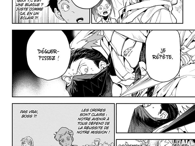 Le dix-septième volume de The Promised Neverland commence l'assaut de Norman sur la capitale pendant la célébration de Tifari. Emma et Ray sont revenus des sept portes après avoir fait la nouvelle promesse et une course est maintenant engagée pour atteindre la capitale afin d'essayer d'arrêter Norman après qu'il soit devenu clair pour tout le monde que son véritable plan est d'anéantir tous les démons, y compris la famille royale. Ensemble, les groupes de Norman et de Geelan se dirigent vers la capitale et s'en emparent. Les calculs de Norman sont parfaits (comme prévu), ce qui rend la réalisation de son plan presque trop facile. La majeure partie du volume est consacrée à l'histoire de Geelan et à son combat contre la famille royale et la reine elle-même. La fin du volume arrive quand Emma arrive à la capitale et se retrouve face à face avec Norman. La description est un peu courte, mais ce volume de The Promised Neverland est assez simple. En bref, le plan de Norman a été mis à exécution, Emma et Ray sont allés les arrêter, des choses se sont passées, et Emma et Norman se sont rencontrés. Bien que l'histoire soit simple, il se passe beaucoup de choses que nous n'avons pas résumées. Nous avons un bon aperçu des démons et de leur hiérarchie, de l'histoire entre la reine et Geelan, et plus encore. Nous ne savons toujours pas la vraie raison pour laquelle Norman fait tout cela. Il a révélé sa main depuis un certain temps maintenant qu'il veut tuer tous les démons, mais la grande question du pourquoi demeure. Peut-être qu'avec la rencontre d'Emma, nous le découvrirons dans le prochain tome, car il ne reste plus qu'une trentaine de chapitres avant de dire au revoir à cette série.