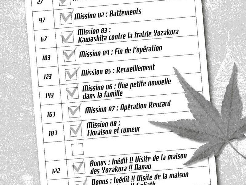 Mission Yozakura Family (Yozakura-san Chi no Daisakusen) est une série toujours en cours de parution au Japon et qui a connu quinze tomes à ce jour au Japon aux éditions Shueisha. Taiyô Asano est un lycéen à la timidité maladive. La seule personne avec qui il arrive à parler normalement est son amie d’enfance Mutsumi Yozakura. Mais cette dernière est la fille d’une famille d’espions qui œuvre depuis plusieurs générations, et son grand frère, qui lui voue une affection excessive, a décidé d’éliminer Taiyô ! Par quel moyen Taiyô va-t-il pouvoir sauver sa peau et en même temps protéger Mutsumi ?!
