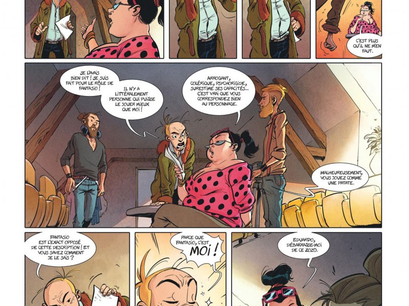 Les aventures de Spirou et Fantasio vont être adaptées sur grand écran. Une perspective qui réjouit surtout Fantasio qui postule pour jouer son propre rôle ... sauf que le metteur en scène le trouve trop vieux. On lui propose dès lors d'auditionner pour le rôle du Comte de Champignac, "un vieillard qui sent le champignon", mais Fantasio est un piètre comédien. Son caractère ne correspond pas du tout à celui de Pacôme (calme, bienveillant et fantasque) et on le décrit comme "arrogant, colérique, psychorigide". Bref, tout commence pour le mieux. A peine rentré chez Spirou qu'il décide de ressortir son emblématique costume de l'ère Franquin, sauf qu'il ne peut plus rentrer dedans ! Spirou tente de lui remonter le moral et c'est alors qu'il apprend enfin l'existence de ce projet de biopic. Il propose à Fantasio d'aller sur le tournage en tant que journaliste afin de concevoir un making of pour le Moustique. Sur le plateau, Spirou est déconcerté par l'acteur choisi par la production pour incarner son personnage ("lisse et sans personnalité") alors que le comédien s'avère très ressemblant. Même Seccotine est déçue du scénario car on la cantonne au rang de femme-objet et le réalisateur n'a pas vraiment une bonne réputation. Plus étonnant, le producteur ressemble beaucoup à Zorglub. Vraiment beaucoup.