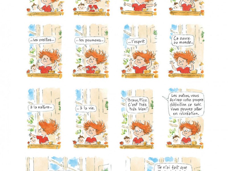 Pico n'est jamais avare en discussions, même quand il n'a rien à dire, ni même en pitreries. Heureusement, ses parents sont d'une patience à toute épreuve, l'habitude sans nul doute. Les dialogues sont savoureux, et souvent plein de philosophie (ça change de Descartes et de Platon). Les quarante-huit pages se parcourent d'une traite, mais la fragile innocence des personnages a laissé la place à un long débat autour de l'art, une façon de peut être renouveler l'exercice et cela fonctionne très bien ainsi. Les expressions des personnages sont vraiment bien travaillées, et chaque situation est savamment étudiée. Parfois un simple regard vaut mieux qu'un long discours, Pico Bogue est là pour le rappeler. Le dessin affiche pour sa part des aquarelles superbes et un trait toujours aussi fin. Les décors nous replongent quant à eux essentiellement dans la maison de famille et à l'école, mais les situations sont suffisamment variés pour éviter la redite, et on retrouve beaucoup d'humour noir.