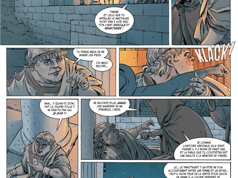 Grèce, 1720 avant JC. Dans un village de la petite île de Sériphos, un aède relate l'histoire de Thésée parti combattre dans le labyrinthe de Cnossos. Le fils d'Egée se porta volontaire pour affronter et éliminer le Minotaure, créature mi-homme et mi-taureau née des amours de Pasiphaée (épouse du roi Minos) et d'un taureau blanc envoyé par Poséidon. Mais pendant que le poète Kléon s'absente, une mystérieuse jeune femme couverte de cicatrices l'agresse et lui ordonne de ne plus raconter l'histoire de Thésée qui n'est qu'un tissu de mensonges. Interloquée, Kléon décide retrouver cette bergère qui vit dans un endroit très reculé. En tant qu'aède, il souhaite connaître ce qui serait la véritable histoire de Thésée. Il s'avère qu'elle est la fille non désirée d'Egée, roi d'Athènes, et de sa maîtresse Ethra. Son paternel fera tuer toute sa famille pour étouffer le scandale, et Thésée deviendra une esclave avant finalement de se rebeller.