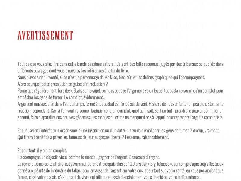 On retrouve également un long passage sur la création d'un centre de recherche sur le tabac financé par Big Tobacco et destiné à truquer les données. Pourtant, l'ouvrage rappelle que le cowboy employé dans les publicités Marlboro a été fréquemment changé, les précédents ayant tous été frappé par un cancer du poumon. Rien n'a voir avec le tabac, selon l'industrie, il n'avait qu'à faire du sport. On découvre également l'utilisation du tabac pendant la guerre, censée symboliser le "symbole du partage et du patriotisme", l'utilisation de l'émancipation des femmes par les communicants pour justifier le fait qu'elles doivent fumer également, les liens entre Hollywood et l'industrie (par exemple Stalonne a du fumer des Brown & Williamson dans cinq films pour toucher 500.000 dollars, alors que d'autres acteurs ont reçu des cadeaux pour poser avec des cigarettes), mais également le fait que l'industrie du tabac est la plus polluante du monde après le pétrole. On découvre également les mesures que les pouvoirs publics ont pris pour tenter de stopper l'hémorragie, à une époque pas si lointaine, il était possible de fumer partout, quelque soit l'âge. L'ouvrage se conclut par un dossier rempli de chiffres, d'études et de données pour résumer ce que l'auteur Pierre Boisserie à énumérer (et souvent dénoncer) dans cet album de 160 pages. Le tout mis en images de manière très dynamique par Stéphane Brangier dans un style qui rappelle celui de Will Eisner, sans compter la présence d'un personnage ironique, Mr Nico, qui donne les explications au fur et à mesure de la lecture et qui représente très clairement la position des industriels. Pour rappel, 78.000 personnes meurent chaque année en France à cause du tabagisme.