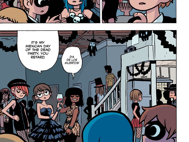 Le sixième tome reprend l’histoire après le départ de Ramona, et nous emmène logiquement vers la confrontation finale avec Gidéon, bien que celle-ci prenne son temps pour arriver, et qu’elle ne ressemble en rien à celle du film. Si vous avez vu l’adaptation, ne croyez donc pas déjà tout savoir, si on retrouve pas mal d’éléments, ils ne sont jamais là où on les attend. A part peut-être la vie supplémentaire, bien évidemment, et encore. A l’image des tomes précédents, c’est extrêmement agréable à lire, et si on a toujours l’impression d’être un peu égaré dans l’histoire, à force de suivre les pérégrinations de Scott qui est dans le brouillard 24h/24, on commence à mieux connaitre le casting et retrouver ses marques. Comme d’habitude, on retrouve les dialogues qui fusent et les retournements de situation absurdes et très vidéoludiques, voir un mélange des deux qui est toujours très savoureux. Oui, l’auteur aime briser le 4e mur, mais c’est tellement assumé que ça passe très bien. La grande qualité de ce tome (qu’on trouvait déjà dans les autres, même si ce n’était pas toujours aussi flagrant), c’est que l’histoire ne s’arrête pas à des combats façon jeux vidéo d’ex maléfiques, au contraire, elle aborde des choses très terre à terre. Sous ses délires, toute l’histoire de Scott est un peu celle du passage à l’âge adulte, et sa relation compliquée avec Ramona lui donne l’occasion de mûrir (tous les deux mûrissent d’ailleurs), d’apprendre à s’accepter et à accepter que l’autre ne soit pas non plus parfait(e). On ne s’attend pas du tout à trouver ça dans ce genre de texte et c’est une chouette réussite d’arriver à parler de choses banales au travers d’un univers très geek. Bien sûr que déclarer son amour à qui ce soit ne permet pas de se sortir une épée du cœur, et que personne n’a jamais gagné des vies supplémentaires en dégommant les ex de sa petite copine, mais finalement c’est juste une autre manière de parler de la vie, d’une façon un peu folle ce qui la rend nettement attirante qu’une histoire plus terre à terre.
