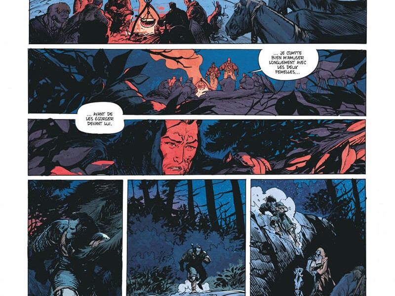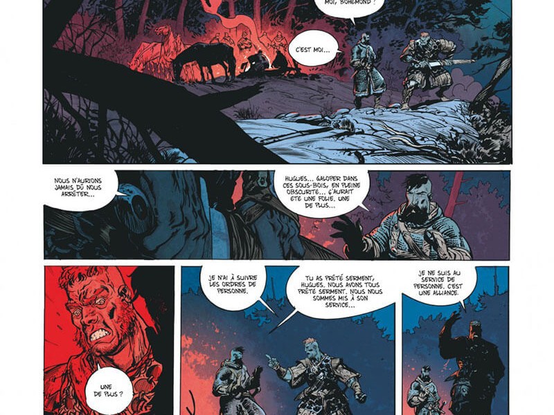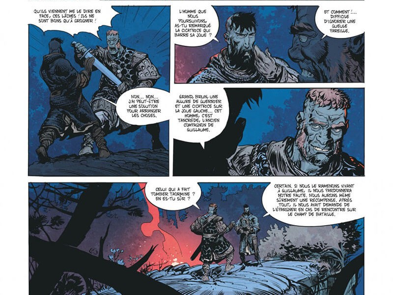 A l'école primaire, nous avons appris dans l'histoire que la période 500-1500 s'appelle le Moyen Âge, une période où nous avons souvent des fantasmes romantiques sur les chevaliers, les demoiselles en détresse, les châteaux, les tournois et les justes combats à l'épée. La réalité était très différente. Toulhaut et Brugeras situent leur série quelque part au milieu du XIe siècle, une période sur laquelle on a peu écrit, mais ce que l'on sait, c'est que la situation était particulièrement bouillante autour de la Méditerranée à l'époque. L'empereur byzantin se bat contre les armées musulmanes, qui tentent de conquérir l'Europe. À leur tour, les dirigeants européens tentent également d'étendre davantage leur territoire. Pendant ce temps, une division se profile à la fois dans le monde islamique et chrétien. Malgré tous ces conflits, il y a aussi beaucoup d'échanges de connaissances et de produits autour de la Méditerranée. De plus, c'est un territoire fertile pour les méchants et les mercenaires qui tentent de s'enrichir. L'une de ces personnes était Robert le Diable, figure légendaire du Moyen Âge et dont s'est inspiré Vincent Brugeras, historien de naissance, pour l'un des personnages principaux d'Ira Dei, Robert Tancrède, un mercenaire normand. (cependant, est-ce son vrai nom?) L'autre est le diacre Etienne, qui tente de répandre de force la vraie foi sur les champs de bataille. "Mon nom est Tancrède" confirme tout le bien que nous pensions des aventures précédentes. Aventures, combat, romantisme, sang et personnages emblématiques tout est réuni pour en faire un future grande saga. On ne boude donc pas son plaisir. Ce quatrième volume est encore riche en action et développements. Les dessins de Ronan Toulhoat sont toujours aussi bruts et précis. Les scènes de combats sont épiques, agressives et d'un dynamisme digne des plus grands combats d'un certain barbare Cimmérien. Le scénario de Brugeas est beaucoup plus profond que ce que l'on peut croire. Subtil mélange d'action, de partie historique peu connue (l'empire Byzantin du début du second millénaire) et de certain contexte géopolitique, il est très entrainant et on tourne les pages avec ardeur.