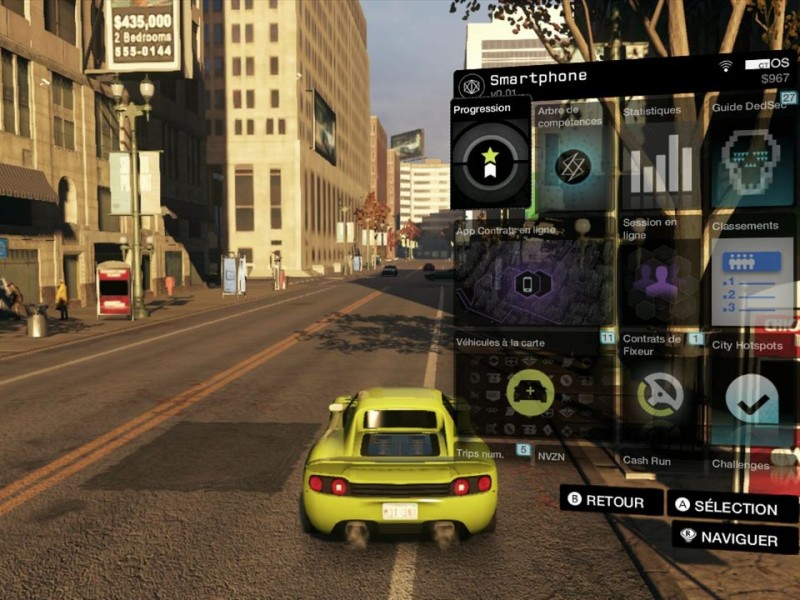 Aiden devra se montrer discret durant l'aventure pour éviter les ennuis, et également résoudre quelques énigmes pour débloquer sa route. Il faut donc utiliser son environnement pour progresser, même si heureusement, nous ne sommes pas démuni en matière d'armement (pistolet, sniper, grenades, etc). Aiden préfère néanmoins les gadgets technologiques pour mettre à mal l'autorité, et grâce à son brouilleur, il est aisé de couper les signaux à proximité (pratique lorsque vous abattez une cible et qu'un passant s'apprête à téléphoner à la police). On pourra également compter sur le scan ctOS pour connaître l'emplacement des ennemis dans un bâtiment, le leurre pour les guider dans un piège, ou encore le Blackout qui neutralise tous les éléments électroniques à proximité de votre position et qui permet donc de fuir rapidement. Notez que toutes ces compétences peuvent être utilisés en voiture, à l'exception des armes à feu. Les phases en voitures (ou à moto) sont très arcade, et on reconnait la touche des développeurs de Driver. La gestion des collisions est quant à elle ubuesque au possible. Pour le réalisme, on repassera. Les phases en bateau sont plus discrètes, mais jouissent d'une physique assez appréciable (surtout celles de la mer). Watch Dogs conserve des bases proches d'un Assassin's Creed, aussi on navigue donc assez vite en terrain connu, et la liberté de déplacement est quasi totale. La ville de Chicago garantit un terrain de jeu plutôt large (bien qu'en deçà d'un GTA V) et il ne devrait pas être compliqué de jouer au jeu du chat et la souris avec les forces de l'ordre. Outre la campagne principale, Watch Dogs comporte de multiples quêtes secondaires facilement retrouvables dans le menu progression. Pour résumé brièvement, vous aurez à mettre à mal des escortes criminelles (soit en éliminant l'une des cibles soit en l'assommant), accepter des crimes détectés (il s'agit de suivre une victime ou un criminel potentiel et d'intervenir afin d'empêcher un drame ... comme dans Person of Interest), effectuer des contrats de fixeur (il suffit de s'assurer qu'une livraison arrive à bon port), ou encore de pénétrer dans les planques de gang (vous naviguez dans une zone hostile et devrez repérer un chef de gang puis le neutraliser sans le tuer). Les enquêtes ne sont quant à elle accessibles qu'une fois débloquées auprès des tours ctOS. Au programme, de la récupération d'objets, la recherche de codes QR, ou encore la découverte d'une scène de crime. Quelques mini-jeux sont également de la partie, avec du poker (Aiden peut mesurer le degré de stress des participants), des échecs à finir en un minimum de coups, et bien sur du classique bonneteau dans les rues lugubres de la ville. Enfin, les Digital Trips (des séquences sous acide) sont proposés, et permettent de s'amuser en dehors des sentiers battus. Une progression dirigiste ?Contrairement à ce que l'on aurait pu penser, Watch Dogs n'impose finalement que peu de choix. Une fois la mission présentée, libre à vous de déterminer comment venir à bout de votre objectif, et si vous souhaitez employer la manière forte ou privilégier la discrétion. On pourra trouver un certain côté Splinter Cell en détournant l'attention des gardes, en créant des diversions ou en utilisant les caméras pour repérer la position des gardes. Quelque soit l'option choisie, les affrontements sont d'un grand dynamisme, et certaines séquences sont d'ailleurs assez violentes (oui le jeu est 18 + rappelons le). En outre, l'intelligence artificielle est une vraie surprise et marque une progression depuis la précédente génération de consoles en affichant des réactions beaucoup plus pertinentes. Si vous ratez un objectif, lorsque vous recommencerez la mission, les gardes ne seront plus les mêmes et il faudra modifier votre stratégie ! Si vous êtes repéré par un ennemi, il faudra fuir rapidement ou sortir les armes à feu, les concurrents étant pour le moins agressifs. Et si un cadavre traine quelque part dans un bâtiment, ils n'hésiteront pas à lancer l'alerte (l'alarme peut être bloqué si vous piratez les communications, ce qui consomme toutefois quelques points de batterie). Les habitants de Chicago sont très nombreux à se balader dans les rues, soit autant de victimes potentiels pour Aiden. Avec le profiler, vous pourrez connaître précisément leurs identités et même leurs revenus. Certains personnages pourront être piratés ce qui vous offrira la possibilité de retirer de l'argent dans un distributeur automatique, mais aussi de récupérer quelques éléments pour crafter les outils de piratage. Enfin, à l'instar du récent inFamous, les actions effectuées dans Watch Dogs auront des conséquences sur la réputation du personnage. Si vous décidez d'opter pour une approche morale de l'aventure, en sauvant des civils ou en arrêtant des voleurs, les habitants vous considéreront comme un justicier. A contrario si vous détruisez tout sur votre passage, les gens n'hésiteront pas à appeler la police ... Techniquement à la hauteur ?