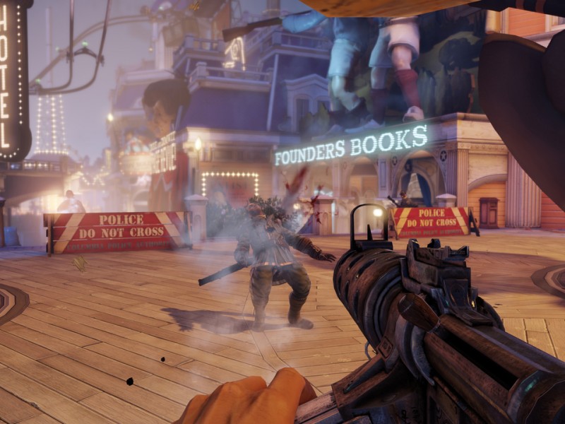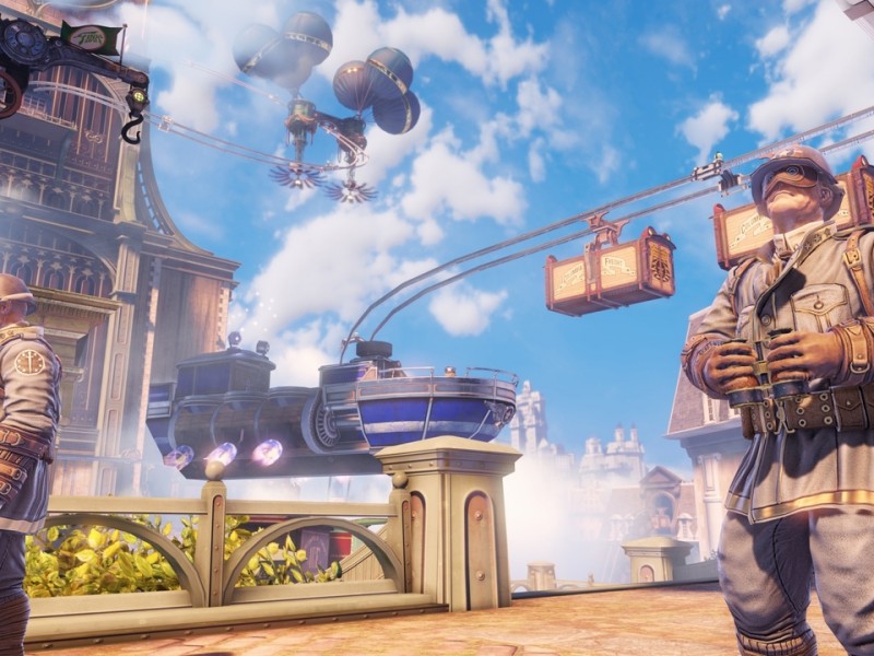 Le personnage d'Elizabeth est très présent dans BioShock Infinite, et cette jeune femme vous accompagnera d'ailleurs pendant une grande partie de l'aventure. Au fil de l'aventure, vous la verrez exprimer différentes émotions, et ses traits ont volontairement été accentués pour renforcer l'immersion. Elle peut également se montre utile en ouvrant des portes et des coffres verrouillés, en vous confiant des munitions, du cristal ou des rations de soin durant les combats, ou encore de déchiffrer les codes mystères dans les quêtes secondaires. Enfin, Elizabeth pourra également créer des portails vers d'autres dimensions, ce qui permet de modifier considérablement son environnement. Si BioShock Infinite ne comporte pas de mode multijoueur, sa durée de vie promet une campagne de dix heures en ligne droite, quinze si vous explorer un minimum les secrets de Columbia. En outre, terminer le jeu permet de débloquer le fameux mode 1999 qui augmente grandement la difficulté. Contrairement à ses ainés, BioShock Infinite tourne sur une version modifiée de l'Unreal Engine 3. Sur consoles, le rendu n'est pas toujours parfait, notamment du côté des textures, mais la patte artistique est excellente, et le jeu des lumières très impressionnante. On appréciera l'inventité qui émane de la ville de Columbia, contrairement à l'intelligence artificielle des ennemis qui demeure assez faible, et les affrontements très dynamiques qui ponctuent la progression. La musique intradiégétique est très présente, et les personnages chantent des mélodies envoutantes. Les thèmes d'ambiances sont d'une grande qualité, tandis que le doublage français est assez crédible. VERDICT-Moins torturé que le premier épisode, Bioshock Infinite est un titre enchanteur. On appréciera particulièrement son design très recherché, le plaisir de la découverte de Columbia, ou encore l'aventure en elle-même davantage tournée vers l'action que sur le huis clos aérien et le sentiment d'oppression. Davantage qu'un simple FPS, le titre d'Irrational Games dispose d'une aura incontestable et malgré quelques problèmes techniques sur consoles, BioShock Infinite est un jeu magistral. |