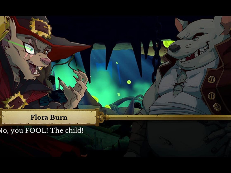 Prenez l'un des genres les plus populaires de tous les temps, qui connaît une seconde jeunesse depuis une dizaine d'années, prenez un style graphique cartoonesque attrayant, ajoutez une intrigue pirate savoureuse et... des rats. Ce sont les ingrédients utilisés par Petoons Studio et PQube pour créer leur Curse of the Sea Rats, un metroidvania qui pique la curiosité pour certaines de ses mécaniques, et qui séduit dès le premier coup d'œil pour son aspect cartoonesque, qui compte tenu également de l'animal de référence rendu anthropomorphe, ne peut que rappeler ce chef-d'œuvre de l'animation qu'est Brisby et le Secret de NIMH de 1982. L'intrigue principale de l'aventure est introduite par une courte vidéo d'ouverture, suivie immédiatement de quelques dialogues très simples. Le navire du capitaine britannique Benjamin Fabbro a été attaqué sur la côte irlandaise par la sombre sorcière pirate Flora Burn, qui a transformé tout l'équipage, y compris le capitaine, en rats anthropomorphes grâce au pouvoir d'un anneau. Comme si cela ne suffisait pas, en plus de se présenter comme une menace grandissante par l'utilisation de ce pouvoir arcanique, la sorcière a kidnappé le jeune fils du capitaine, Timothy (un autre facteur qui s'avère probablement être une autre référence au Secret de NIMH). Malheureusement, tout ce que le capitaine peut faire, pour ne pas abandonner le navire et son équipage, c'est d'envoyer une poignée de quatre prisonniers de l'Empire britannique avec pour mission de sauver son fils, de récupérer l'anneau et de retrouver les corps humains. Comme c'est souvent le cas, les choses vont de mal en pis, et notre aventure commence vraiment peu après. Dans les premières étapes, nous rencontrerons également Wu Yun, un esprit présent à l'intérieur de l'Amulette Ancestrale qui nous a été remise au début du jeu, ainsi que l'autre fragment de l'Œil du Serpent, le joyau qui va de pair avec l'anneau de la sorcière. Wu Yun nous aidera et nous guidera tout au long de l'aventure, en nous permettant d'augmenter notre puissance, de nous téléporter, de nous soigner au maximum, et en nous faisant changer ou sélectionner le(s) héros actif(s). Mais qui sont nos quatre héros ?