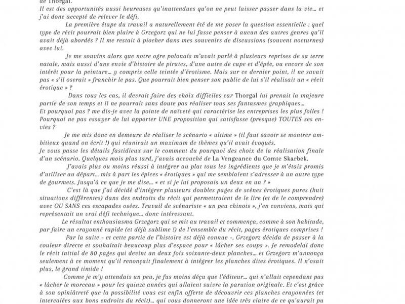 Ce thriller de vengeance évoque sans nul doute Le Comte de Monte Cristo, ce qui facilite la recherche de la véritable identité du comte Skarbek. Sente parvient à ponctuer subtilement l’album de clins d’œil à d’autres histoires (notamment le Comte de Monte Cristo d’Alexandre Dumas) et des faits et chiffres historiques (Frédéric Chopin , l’indépendance de la Belgique, etc). Les scènes de cour réservent des feux d'artifice verbaux, des suspicions surprenantes et des révélations étonnantes qui éveillent le public en un "ooooh" allongé. Dans d'autres moments, nous nous retrouvons dans des intérieurs de salles sombres, dans des studios colorés à Paris, sous un soleil tropical parmi les autochtones ou les pirates, de sorte que l'histoire est plus qu'un thriller judiciaire. Le plus grand honneur, cependant, est réservé à Rosinski, qui prouve une fois encore qu'il est un dessinateur / peintre expressif. Nous avons l'impression qu'il pouvait tranquillement prendre son temps pour cet album. En tout état de cause, Rosinski sait comment dépeindre les émotions de manière frappante, même si cela se passe dans le contexte de Skarbek avec plus de panache et une expressivité diabolique pour un impact plus grand, voire exagéré. Thorgal a un caractère plus calme et réagit moins violemment que les personnages de cette saga.
