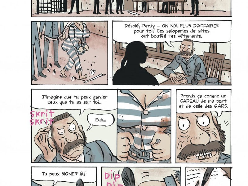 Voici le premier tome consacré à une héroïne de Far West unique dans sa catégorie. Une Calamity Jane XXL nommée Perdy. Nous faisons connaissance avec elle à sa sortie du pénitencier de Yuma où elle a semble t-il laissé des souvenirs impérissables que ce soit chez ses camarades de cellule que chez les matons qui lui annoncent non sans épanchements larmoyants qu’elle va leur manquer. Perdy ne va pas pour autant changer de cap sitôt la liberté retrouvée. Elle se procure vivres et munitions ainsi qu’un cheval chez les premiers fermiers venus puis se rend à Petiteville où vit une dénommée Rose qui subjugue la population masculine en officiant comme fleuriste de la ville. Rose et Perdy sont à jamais liées par un fort lien de parenté mais la première ne souhaite pas la bienvenue à la seconde, elle la récuse quand bien même Perdy lui présente un avenir radieux grâce au plan qu’elle lui soumet comme au bon vieux temps quand elles braquaient des banques. Voici un ouvrage rafraîchissant avec une femme qui est plus grande que nature, sex-positive et tellement amusante. Très divertissant, extrêmement drôle, mais surtout, sans vergogne féministe sans essayer de faire une déclaration. Notez que ce livre signé Kickliy (Musnet) est paru aux États-Unis chez Image Comics.