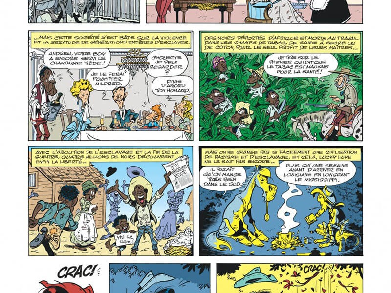 Notre cow-boy qui tire plus vite que son ombre a décidé de prendre des vacances pour enfin se reposer. Du moins, c'est ce qu'il croit car, quand ce n'est pas lui qui court au devant des aventures, ce sont bien les aventures qui viennent à lui, et en l'occurrence ici, le voilà devenu en un clin d’œil le richissime héritier d'une immense plantation de coton en Nouvelle-Orléans ! Il se trouve ainsi plongé malgré lui dans un univers qui lui est totalement étranger où les champs de coton sont de l'or blanc et où l'abolition de l'esclavage est encore loin d'être acceptée conduisant ainsi aux menaces de plus en plus terrifiantes du Ku Klux Klan. Mais Lucky Luke n'a évidemment pas l'intention de rester sans rien faire alors aidé de son vieil ami Bass, shérif noir qui vient justement de ramener au pénitencier certains bandits du nom de Dalton... car oui, que serait un album de Lucky Luke sans cette joyeuse fratrie qui est toujours aussi touchante qu'amusante ! On vous laisse d'ailleurs découvrir la tête de Joe quand il entend que son ennemi juré est devenu l'homme le plus riche de Louisiane ...