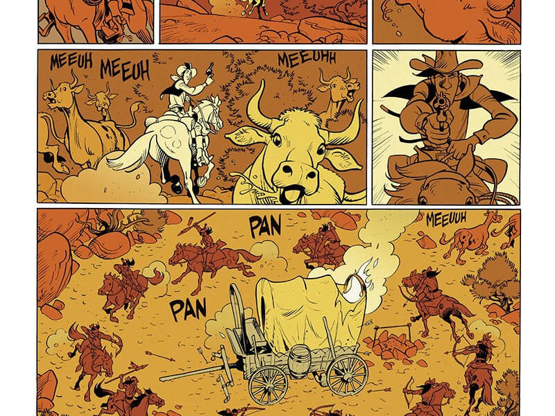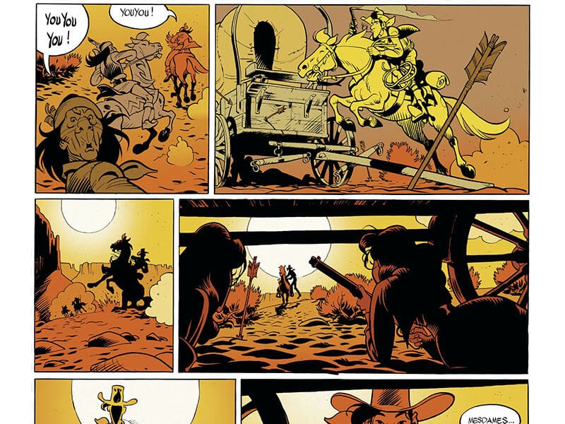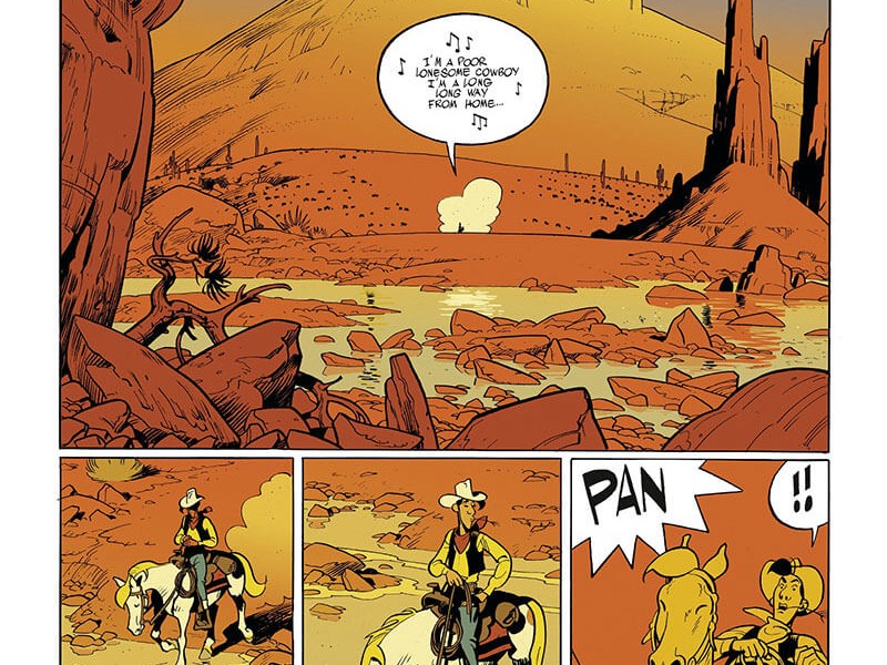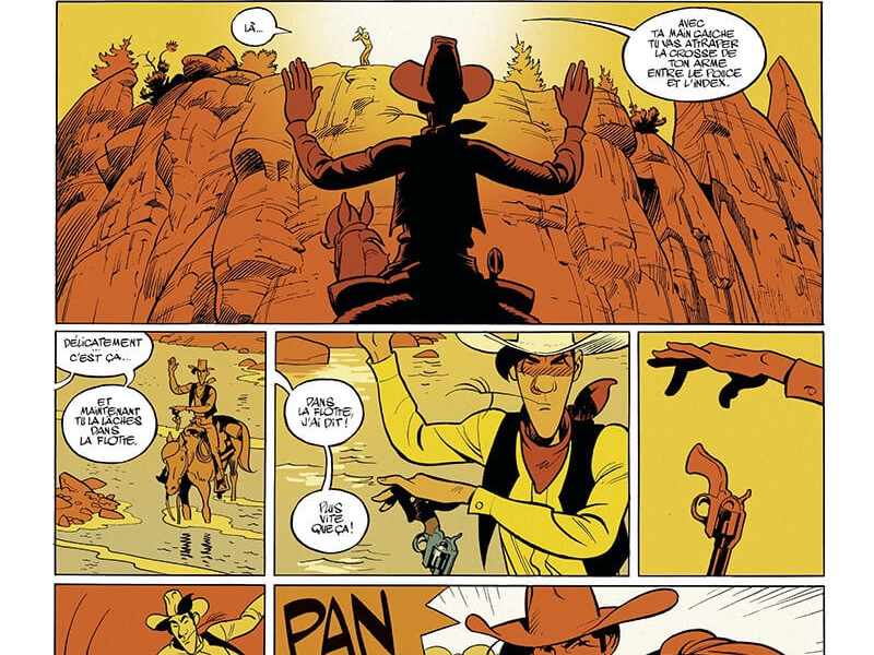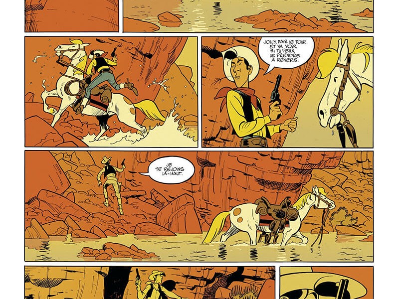 Recherché par une bande de criminels, accusé de meurtre et accompagné de trois beautés ... oui oui curieux de savoir comment notre cow-boy parviendra à échapper à cette situation "désastreuse"? Avec diverses références aux westerns cultes dans les films tels que "The Last Wagon", "Day of the Outlaw" et "Yellow Sky" pour les cinéphiles parmi nous. Quel plaisir de retrouver le cowboy solitaire sous la plume de Matthieu Bonhomme ! Il n'est pas courant qu’une reprise de personnages soit une telle réussite et bien que le style graphique diffère de celui de Morris, il s’agit sans aucun doute de la version la plus intéressante depuis le Lucky Luke historique. Et l’exercice est encore plus remarquable lorsqu'on sait que l’excellent scénario et la superbe colorisation sont aussi l’œuvre de Matthieu Bonhomme. C’est une histoire haletante et pleine de rebondissements que nous propose de vivre l’auteur et quand nous disons vivre, c’est bien d’une immersion dont il s’agit tant le scénario est prenant. Tout y est ! De l’humour (que dire de Brad Defer le fils de Phil), de l’émotion (notamment avec la déclaration de Cherry) et bien sûr de l’action à revendre.