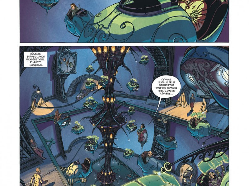 Rappelons que ce volet est un opus de la série "Une aventure de Spirou et Fantasio par ...". Facilement repérable en libraire, la bande dessinée arbore un format différent (beaucoup plus grand), une identité graphique qui tranche avec la série classique, et aussi un prix légèrement plus élevé. Le scénariste Dennis-Pierre Filippi (Voyage Extraordinaire) nous propose un récit futuriste évoluant dans un univers steampunk néo-rétro, c'est à dire futuriste tel qu'on aurait pu l'imaginer dans les années 1980 (ils manquent les néons fluorescents ceci dit) où la société est régie par un système de niveaux déterminé par l code génétique (comme dans Bienvenue à Gatacca). Les principaux personnages de la série ont ici des liens de parenté et l'administration a ici tout d'une dictature. L'histoire est passionnante, remplie de nombreuses références aux anciennes aventures du groom, le suspense est bien entretenu et le dessin de Lebeault (Horologiom) demeure toujours aussi réussi, avec une avalanche de détails, des décors d'une belle diversité, et un Spirou très singulier. Même Spip n'a rien d'un écureuil et Fantasio joue les James Bond (loin de sa représentation habituelle). Le cliffhanger de la dernière planche donne aux aventures de Spirou (de Franquin notamment), une toute autre perspective.