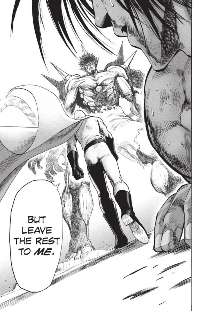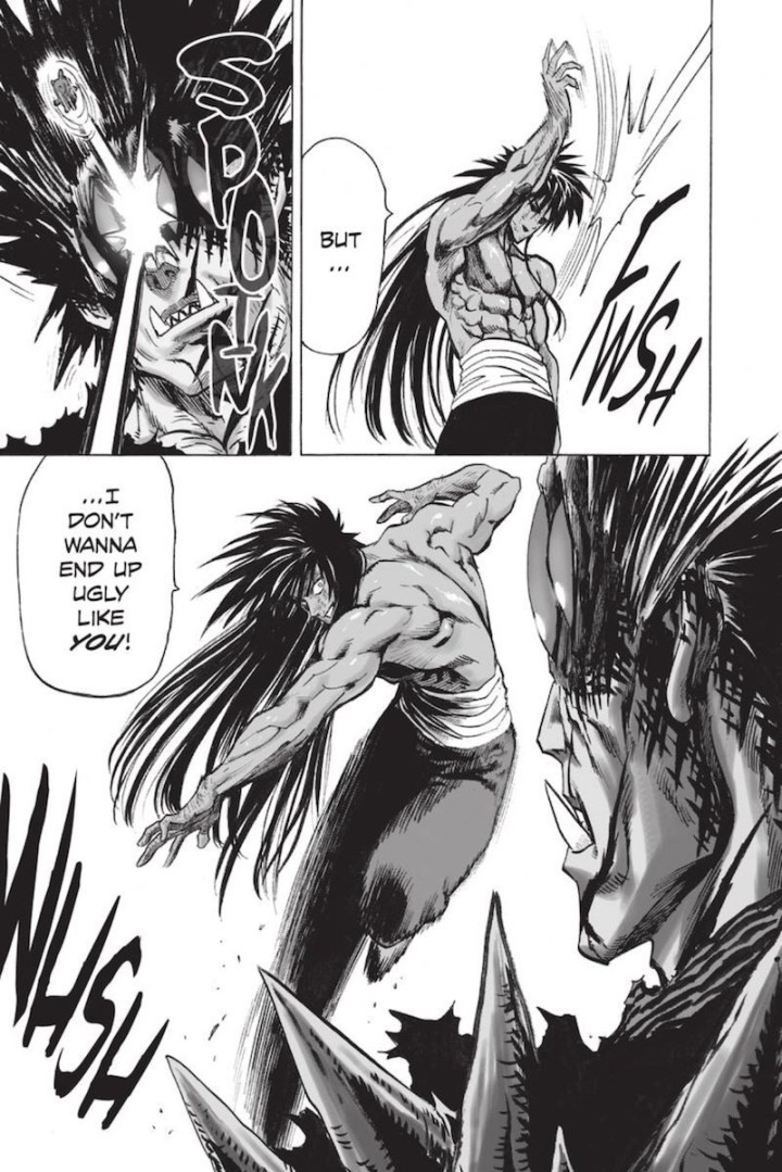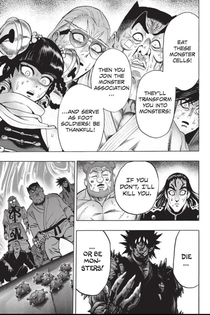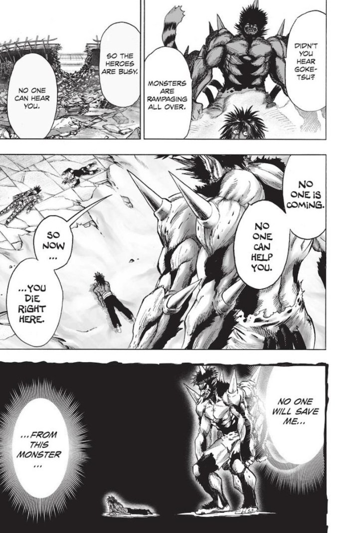 Le volume treize s'est arrêté avec divers artistes martiaux entrant dans l'arène et se disputant leur place dans les rangs supérieurs. Des héros de tout genre, ainsi que des artistes martiaux talentueux du monde entier convergent vers le stade pour prouver leur valeur. Cependant, l'association des monstres a réussi à utiliser la compétition comme une distraction. Tandis que de nombreux héros s'affairent, de nombreuses attaques de monstres commencent à s'abattre sur la ville en même temps. Ce volume quatorze dévoile un puissant monstre connu sous le nom de Mutant (Goketsu) qui se révèle aux combattants de la compétition, leur offrant la possibilité de manger des «cellules de monstres» et de devenir des monstres, ou d'être tué par lui. De nombreux combattants potentiels l'acceptent, intimidés par sa présence. Suiryû, le vainqueur du tournoi doté d'une puissance et d'une capacité surprenantes, décline, craignant que cela ne le rende laid. Il affronte un autre combattant qui a mangé les cellules du monstre, mettant en valeur ses compétences et son habileté. En abordant son premier adversaire, Suiryû admet que si Goketsu est aussi fort qu’il le dit, c’est que le combat pourrait être «difficile». Il ne sait pas à quel point la différence entre eux est grande. Suiryû débute avec certaines de ses attaques les plus virulentes, suscitant l'enthousiasme et l'espoir de ceux qui ne savent toujours pas s'ils mangeront les cellules du monstre ou non. Mutant, cependant, n'est pas impressionné. Il attrape facilement Suiryû et commence à le rouer de coups. Meurtri et malmené, Goketsu joue avec Suiryu, démontrant ainsi son immense pouvoir. Les héros de classe A, Snek et Lightning Max, tentent de venir en aide à Suiryû, mais Suiryû est envahi par la peur et tente de fuir le combat. Goketsu assomme les héros rapidement et continue son assaut sur l'artiste martial impuissant. Finalement, un autre combattant nommé Bakuzan apparaît, qui avait déjà eu des ennuis avec Suiryû auparavant. Il mange une poignée de cellules de monstres et, à la surprise de Goketsu, il devient tout à fait une menace de la classe Dragon. Toujours faible comparé à Goketsu, Bakuzan passe du temps à torturer Suiryû, à lui briser les jambes et à frapper son corps déjà vaincu. Suiryû tente d'appeler à l'aide un héros proche, mais tout le monde est occupé à combattre les autres attaques de monstres. Au moment où tout espoir semble perdu, un héros familier fait son apparition - Saitama arrive !