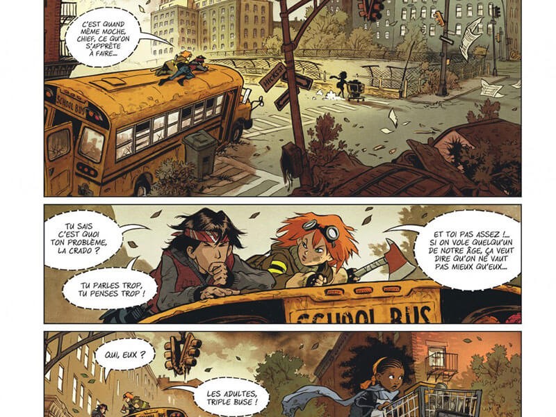 Même si l'univers mis en place par Stéphane Betbeder s'inspire clairement de Seuls mélangé avec Green Class, il parvient à y ajouter un soupçon de Chtulhu (ou bien le nom de la révélation finale relève de la coïncidence plus que troublante), pour un résultat très satisfaisant qui fuse constamment sans démériter. À l'image de la gastronomie, ce n'est pas parce que ce récit part avec des ingrédients connus, reconnus, balisés, que son goût n’en est pas moins délicieux. Le savoir-faire des cuisiniers compte autant que les ingrédients ! Parfois même plus... Et en matière de cuisine, Stéphane Betbeder et Djief parviennent à servir un plat savoureux dès lors que le lecteur en roue libre se prend à comparer le récit à une métaphore à peine voilée de la préadolescence et de l'adolescence, où confrontés à des parents qui n’appartiendraient pas (plus) au même univers, les enfants devraient se réinventer, se surpasser, pour survivre. Les parents étant désormais identifiés à des boulets moutonniers empêchant les ex-enfants d'agir comme et quand bon leur semble. Partant de ce postulat osé, le récit prend une tournure encore plus intéressante, bien que dans cette analogie osée le lecteur hésitant cherche encore à s'approprier de manière convenable la symbolique exacte des monstres chtoniens. La peur de l'inconnu ? Le graphisme de Djief fait particulièrement bien passer le déroulé de l’histoire. L'un des jeunes héros, visiblement un albinos, ressemble graphiquement à une version sur-vitaminée du Petit Prince, tel que Saint Exupéry l'a lui-même imaginé. Par moment, Djief inscrit aussi la douceur de son trait dans la continuité de la chouette série Koma. Une bonne lecture pour s'initier au genre post apocalyptique.