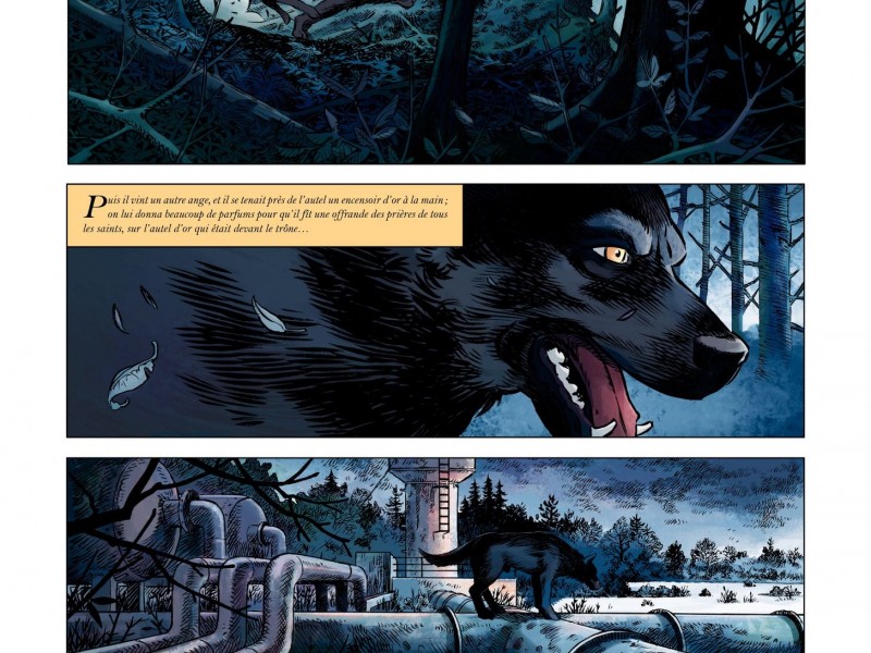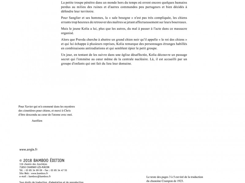 Le scénario d'Aurélien Ducoudray s'attèle à décrire les relations humaines dans un pays au bord de l'explosion. Malgré les conditions hostiles, pour ne pas dire mortelles, difficile de quitter son chez soi. Et comme c'est souvent le cas dans ce climat apocalyptique, les plus bas instincts de l'homme ne tardent pas à se manifester. Ensuite, la dimension religieuse entre en scène, avec l'évocation de Saint Christophe. Dans la religion orthodoxe, le saint est représenté avec une tête de chien, toute une symbolique lorsque l'on sait que ce sont les premières victimes des mercenaires dans la lande irradiée. Ces protagonistes sont pour la plupart rustres et très difficilement empathiques. Seule la destinée d'un jeune garçon semble synonyme de lumière : Attiré par des bruits provenant d'une église, Kolia découvre une bande d'enfants vivants dans les sous-sols de la ville. Surnommés "les enfants de l'atome", ils décident de retourner à la surface pour s'amuser et se baigner. Sauf que la piscine en question n'est autre que la bassin servant à refroidir la centrale nucléaire de Tchernobyl, ce qui explique les difformités dont sont victimes les enfants. Pourtant, certains chasseurs pensent que ces enfants pourraient avoir une valeur marchande importante et ils n'hésiteront pas à les enlever. Le deuxième volume est ainsi encore plus sombre que son prédécesseur, et il est difficile de prévoir qui en sortira indemnes ou non. Le dessin semi-réaliste de Christophe Alliel s'avère parfaitement adapté au récit, avec un trait fin et dynamique. Seules certaines mutations affectant les ukrainiens semblent un peu trop extrêmes et sortis d'un film d'épouvante.