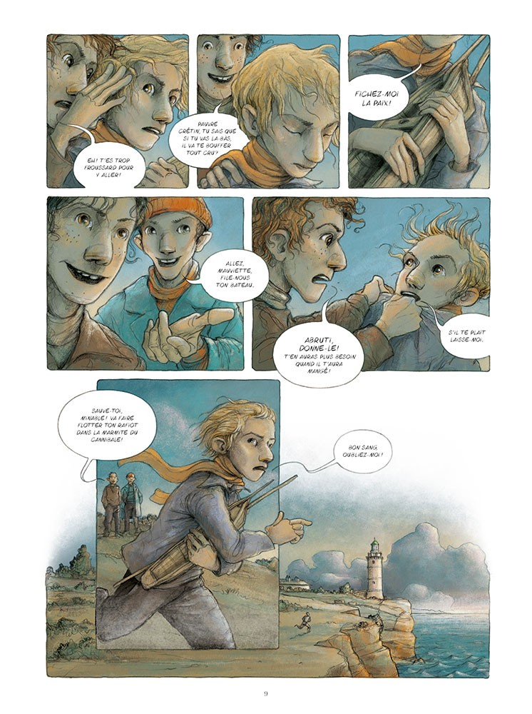 Le personnage de Narcisse Pelletier a réellement existé. Vous pouvez découvrir sa vie dans un ouvrage très réussi car Chanouga propose une histoire fascinante et belle avec des navires détaillés et des tempêtes déchaînées. Sa coloration est belle et utilise ce qui ressort le plus (il est clairement un grand fan du dessin des yeux). L'attention est également portée sur l'homme qui le hait (Obaiya, dont la femme de Narcisse lui était promise), leur enfant et le guérisseur. Dans la postface du tome deux, nous lisons que Narcisse n'a rien dit sur les dix-sept années de sa vie sur l'île. Cette partie est donc principalement une interprétation libre du scénariste / dessinateur. Ce n'est pas une certitude, mais il est probable que Narcisse ait effectivement une famille sur l'île. Le troisième tome est abondamment commenté par un dossier et nous plonge dans une époque où les "blancs" considéraient tout autre race comme des "sauvages".